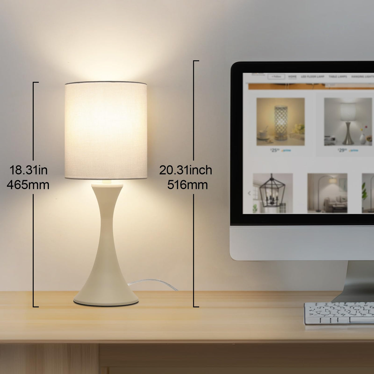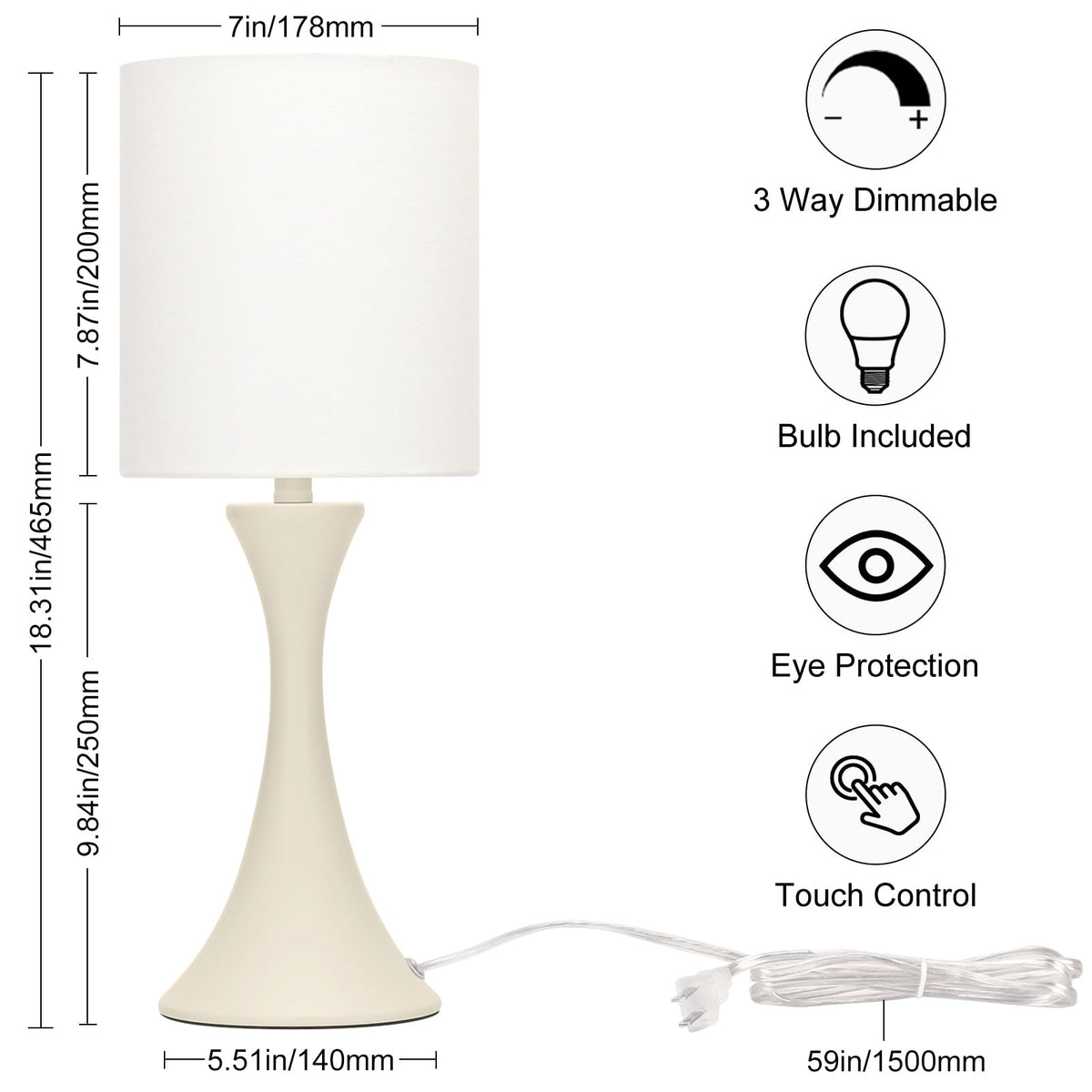 Q: What are the dimensions of the Dimmable Bedside Lamp?A: The Dimmable Bedside Lamp has a height of 18.25 inches, a base diameter of 5.5 inches, and weighs 2.43 pounds, making it a compact and space-saving option for your nightstand or desk.