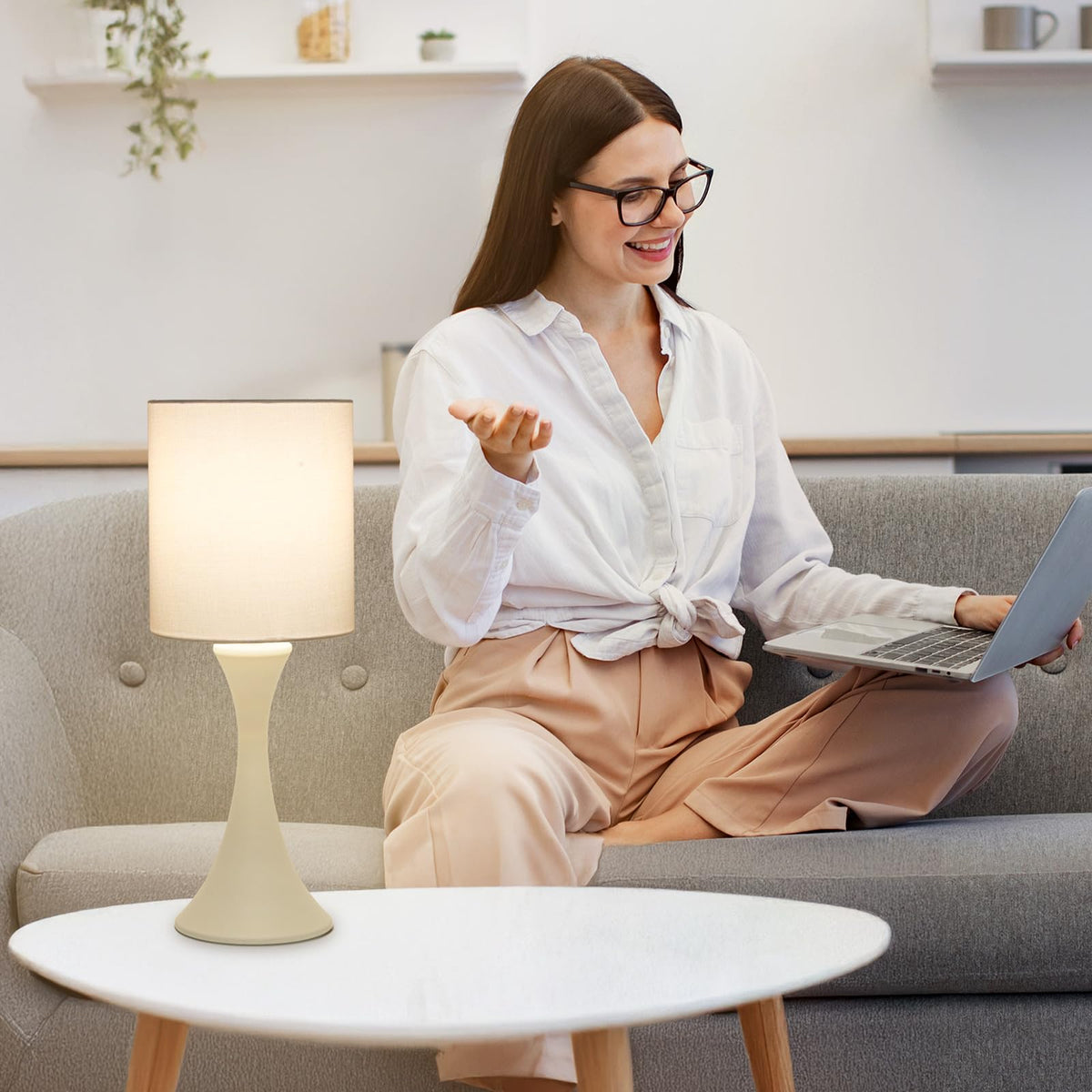 Simple Table Lamp With Beige Fabric Shade And Cream Base, Led Bulb Included