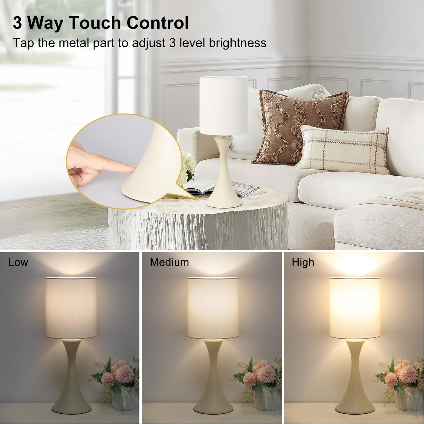 Q: How does the 3-way touch control feature work?A: The lamp features a 3-way dimmable touch control, allowing you to easily change the light brightness to low, medium, or high by simply tapping the base with your finger. This is especially convenient for nighttime use.