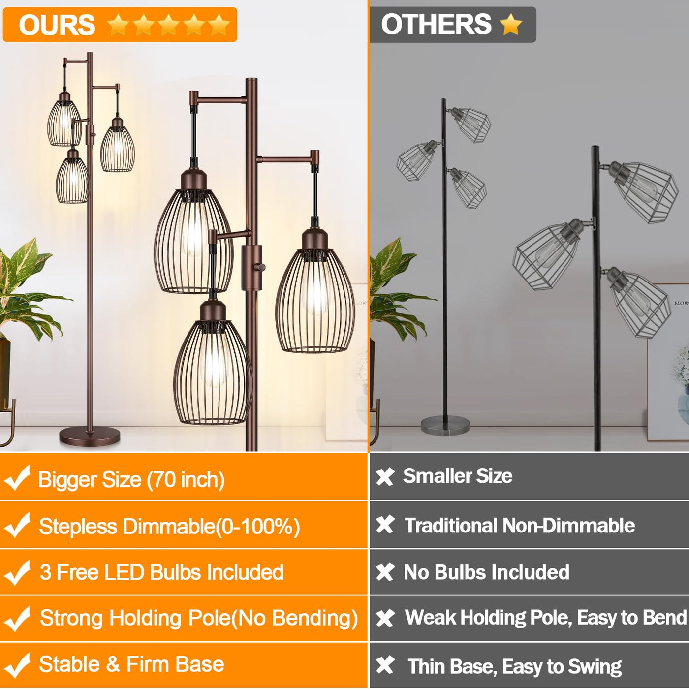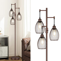Dimmable Farmhouse Industrial Floor Lamp, Matte Brown Tree Standing Tall Lamps With 3 Elegant Teardrop Cage Head & 800 Lumens Le