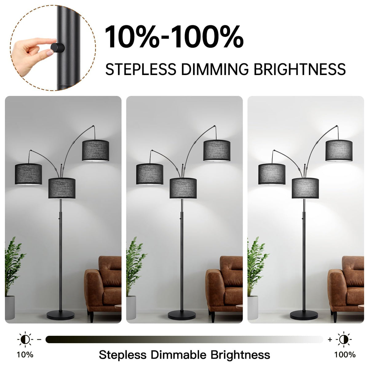 Dimmable Floor Lamp, 3 Lights Black Arc Floor Lamps For Living Room, Modern Tall Standing Tree Lamp With Black Shade & Heavy Bas