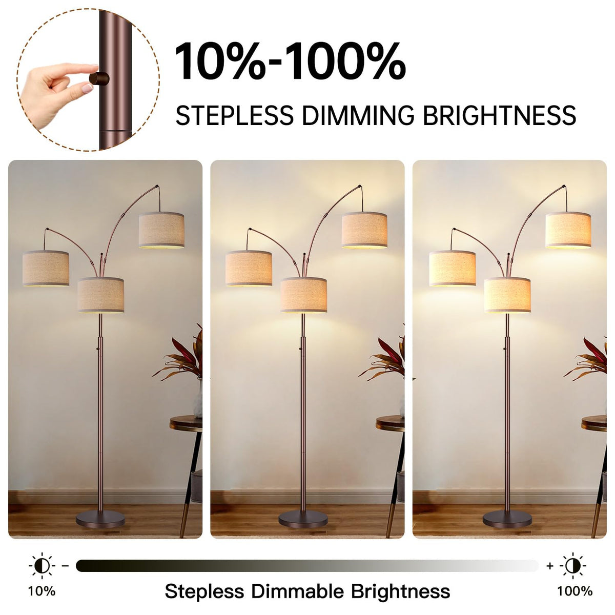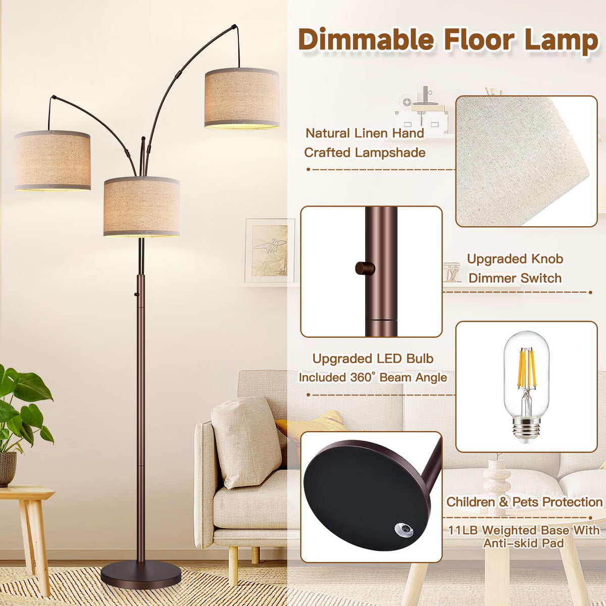 Dimmable Floor Lamp, 3 Lights Brown Arc Floor Lamps For Living Room, Modern Tall Standing Tree Lamp With Beige Linen Shade & Hea