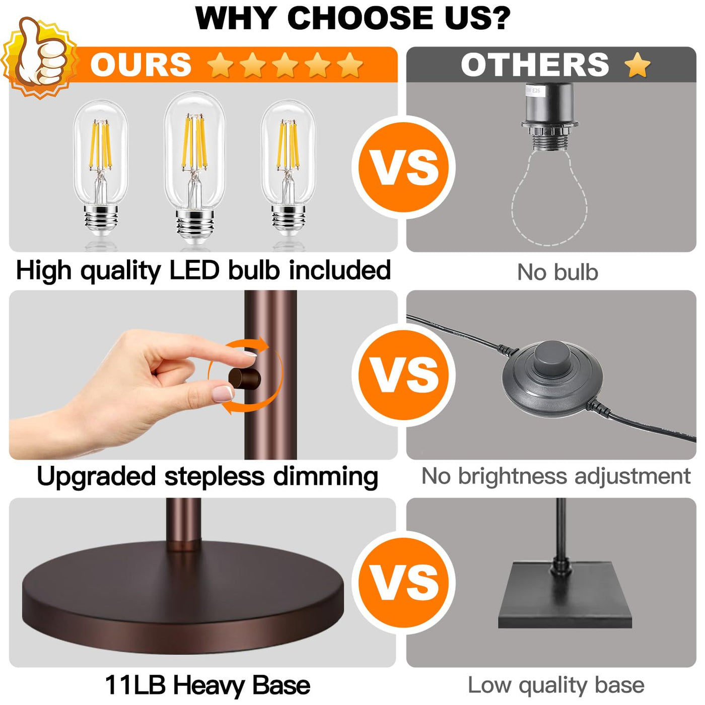 Q: What kind of bulbs does the Dimmable Floor Lamp use?A: The Dimmable Floor Lamp comes with three LED bulbs included, each providing 1000 lumens of brightness, ensuring you have everything you need for optimal lighting right out of the box.