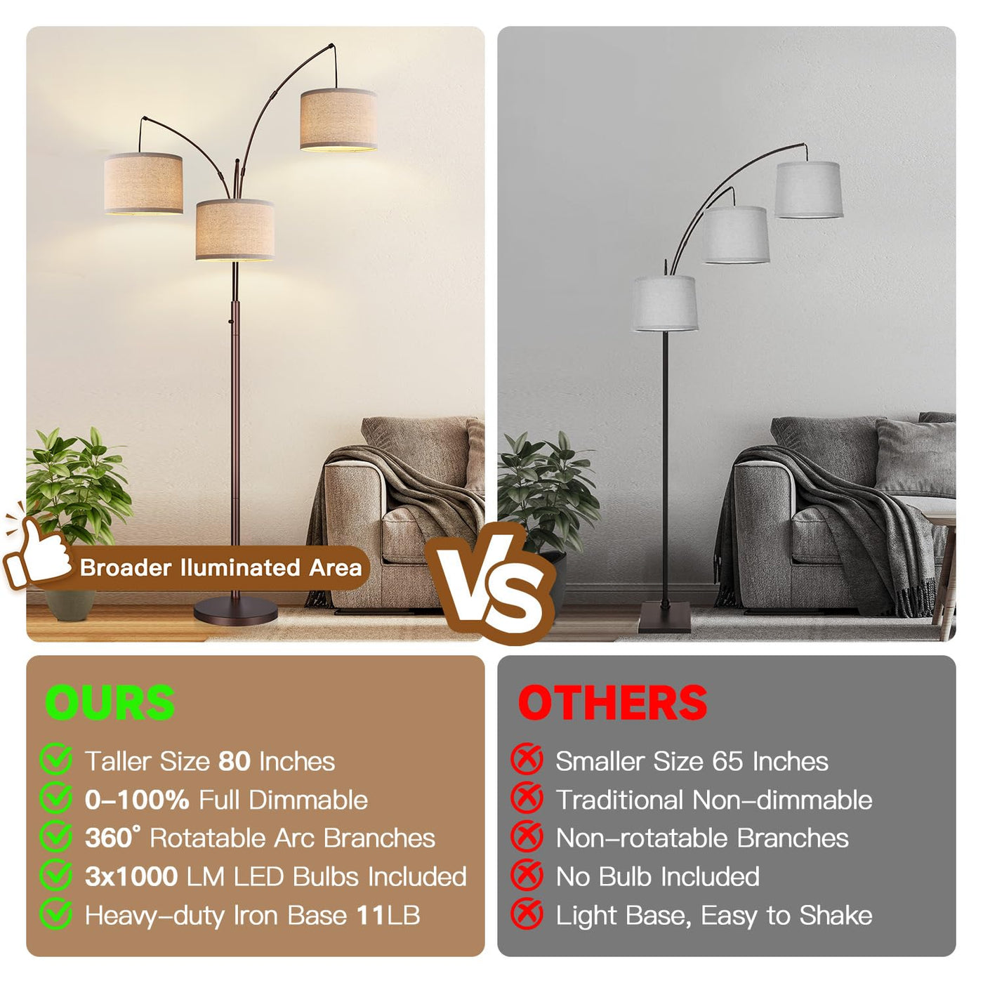 Q: What is the height and design of the Dimmable Floor Lamp?A: The Dimmable Floor Lamp stands at an impressive 80 inches tall and features a modern arc design with three adjustable lamp arms that can rotate 360°, making it both functional and stylish.