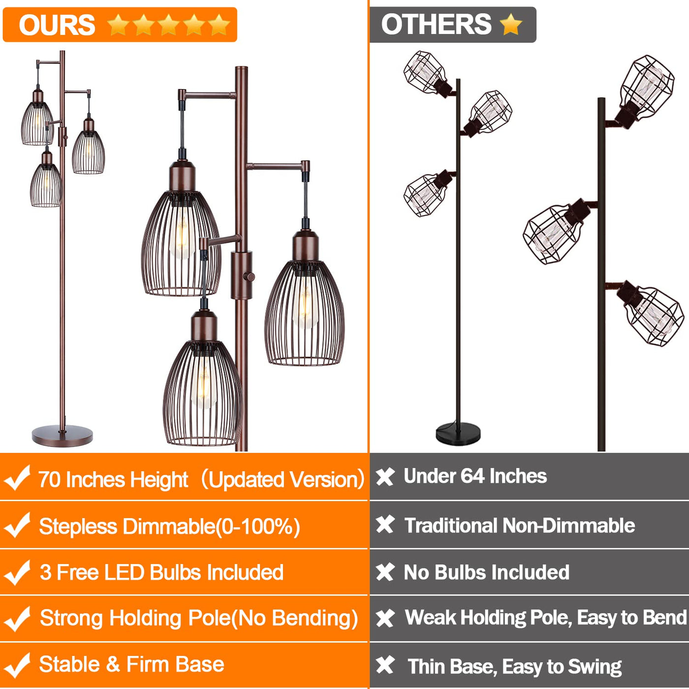 Dimmable Floor Lamp, 3 X 800Lm Led Edison Bulbs Included, Farmhouse Industrial Floor Lamp Standing Lamp With Elegant Teardrop Cage Head Tall Lamp For Living Room Bedroom Office Dining Room - Brown