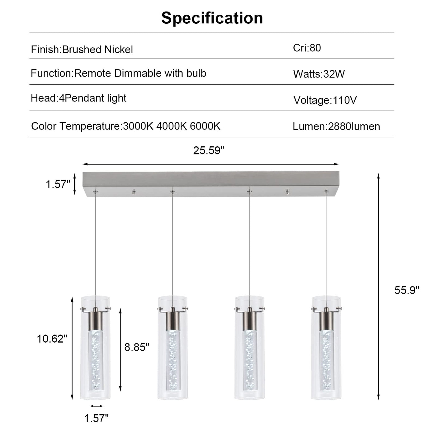 Dimmable Hanging Pendant Lights With Remote, Integrated 4-Light Pendant Lighting Brushed Nickel Finish, Tri-Color Pendant Lights