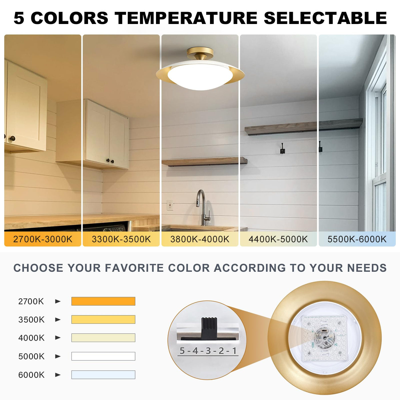 Q: What are the different color temperature options for this ceiling light?A: The Dimmable Mid Century Modern Semi Flush Mount Ceiling Light offers five different color temperature settings: 2700K, 3500K, 4000K, 4500K, and 6000K. This versatility allows you to choose the perfect lighting ambiance for any occasion, from warm and cozy to bright and focused.