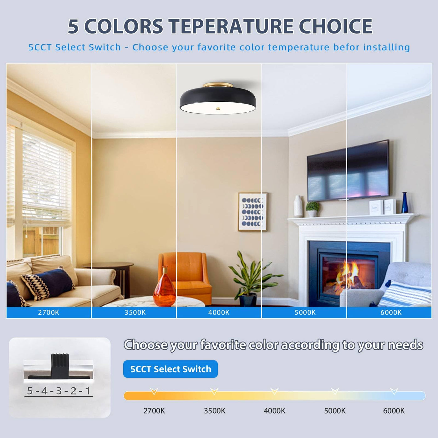 Q: What are the color temperature options available for this LED ceiling light?A: This dimmable LED ceiling light offers five color temperature options ranging from warm 2700K to cool 6000K, allowing you to easily customize the ambiance of your space.