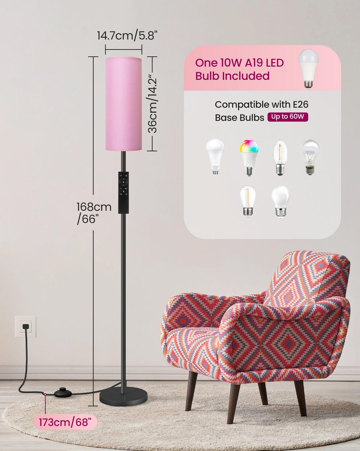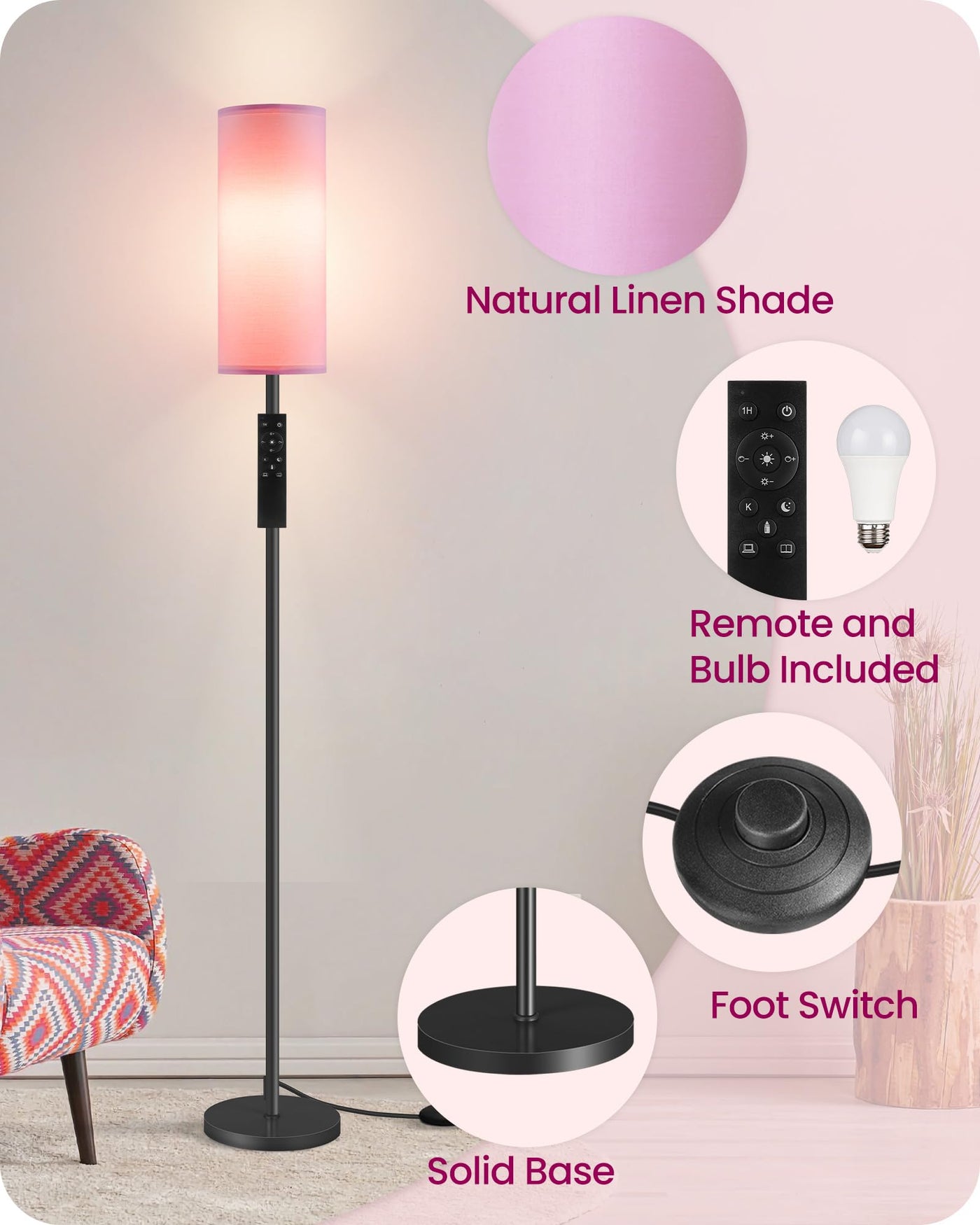 Dimmable Pink Floor Lamp For Living Room With Remote And Foot Switch, Corner Floor Lamp For Bedroom, 66'' Standing Tall Lamp, 10