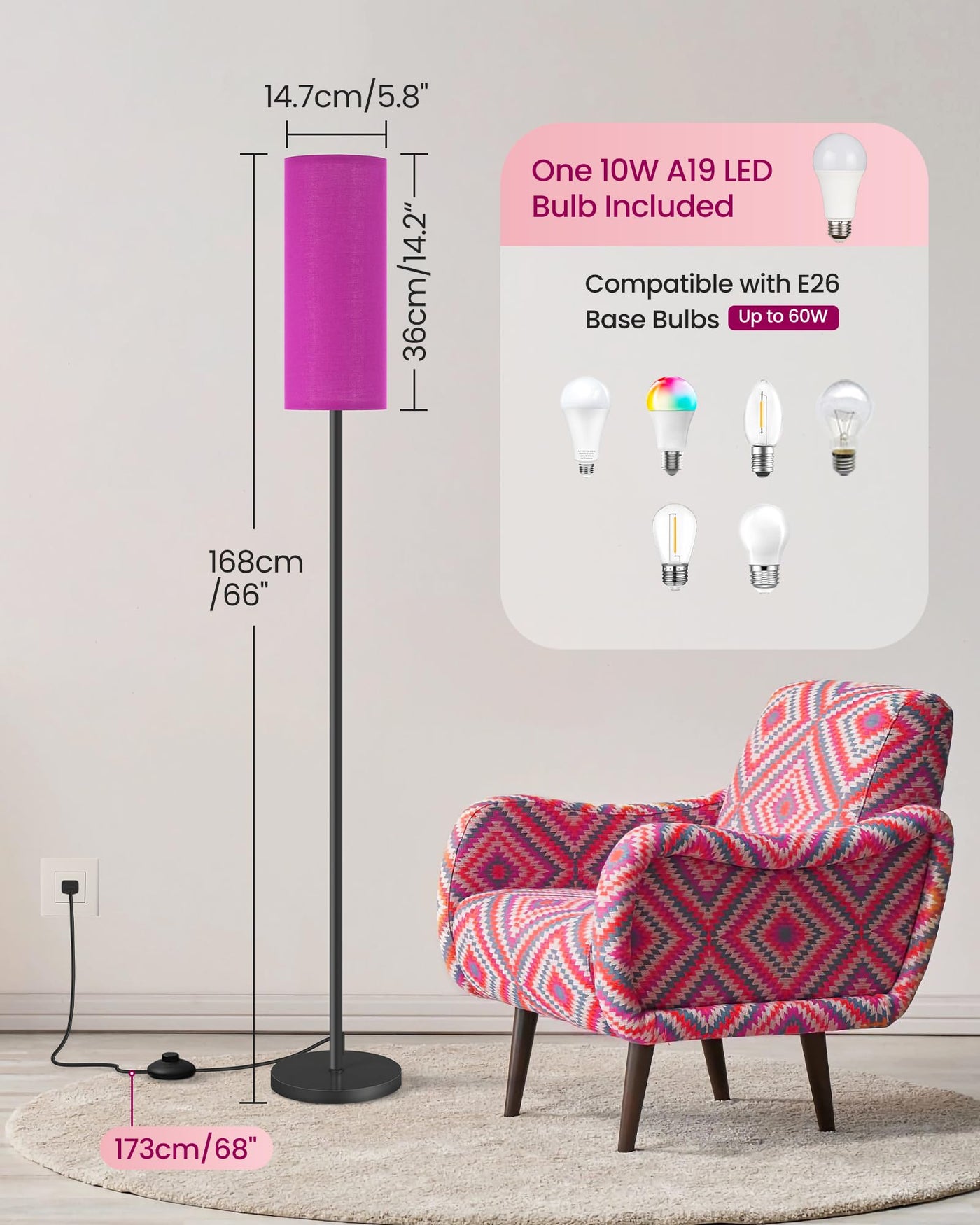 Q: Is the included bulb energy-efficient?A: Yes, the Dimmable Purple Floor Lamp comes with a 10W A19 LED bulb, which is energy-efficient and provides 900 lumens of brightness, ensuring ample illumination while saving on energy costs.
