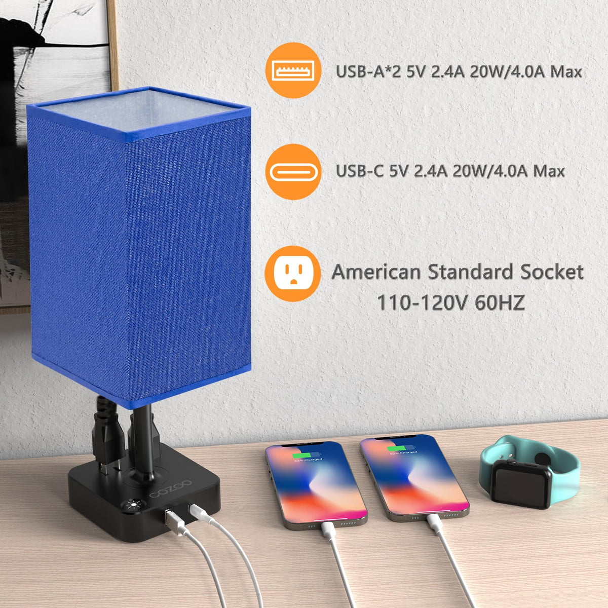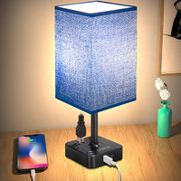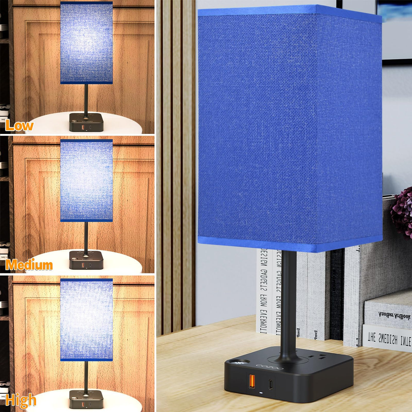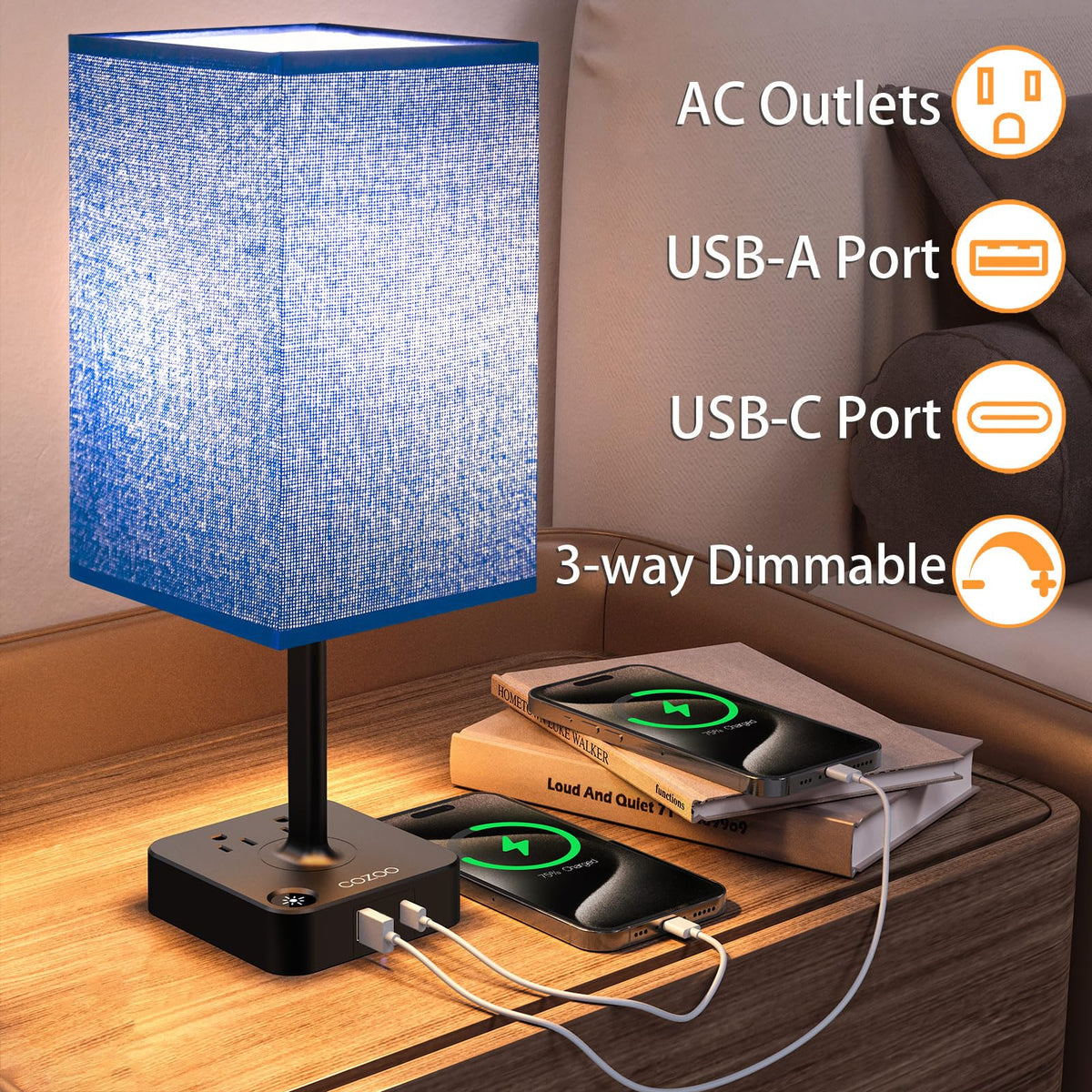 Dimmable Table Lamp With Blue Shade Bedside Lamp With Light Bulb,2 Usb C+A Ports And Dual Ac Outlets,3 Way Dimmable Touch Small