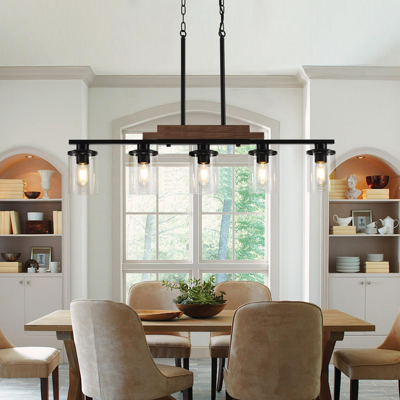 VbiTmn Dining Room Light Fixture Over Table,Farmhouse 5-Light Kitchen Island Lighting, Linear Chandelier with Clear Glass Shades, Modern Rustic Wood Chandelier with Adjustable Height