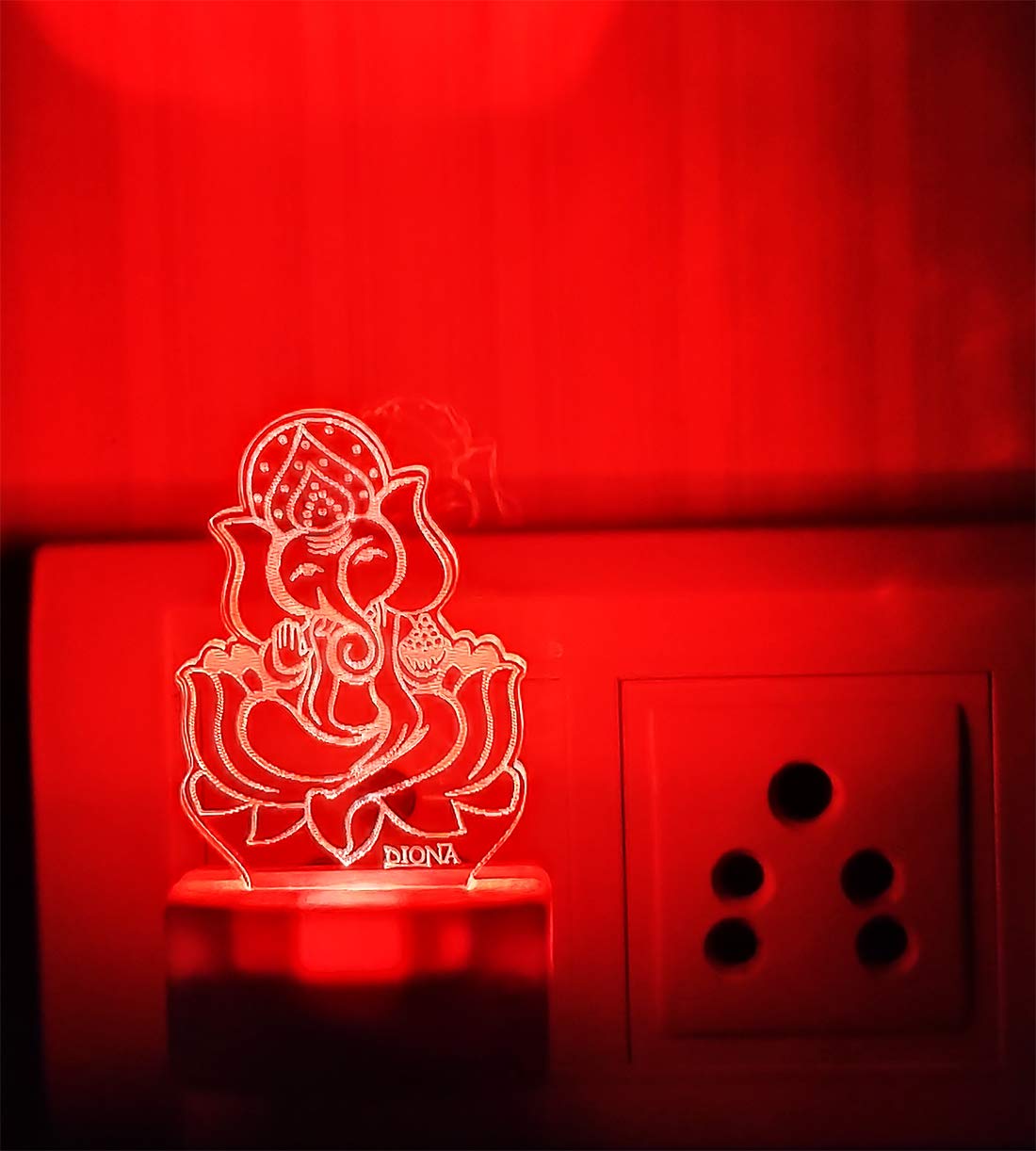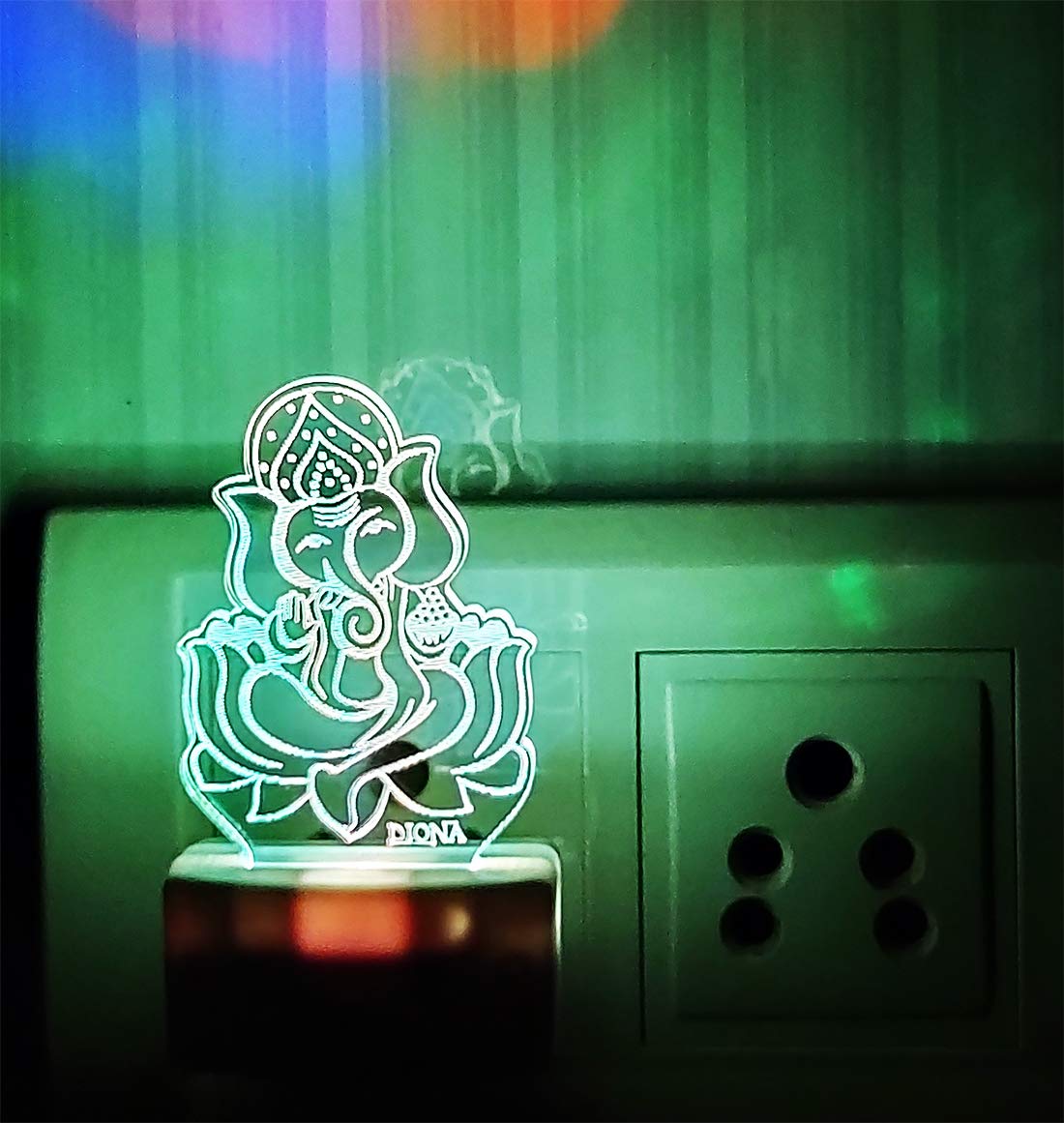 DescriptionDIONA brings you an exclusive small portable 3D illusion led night lamp to illuminate your interiors with bright Multi Colour Changing Night Light. This divine desk lamp bears beautiful images of God (Ganpati Ganesh Ganesha - Gajanand).This night light can be kept in your place of worship to create a mystic feel. This lightweight wall night lamp makes it convenient for you to carry while travelling. Moreover this led 7 colour changing night lamp is easy to install in any corner of your home, office, Church, Hotel, Restaurant etc .. Place for a beautiful lighting effect.
