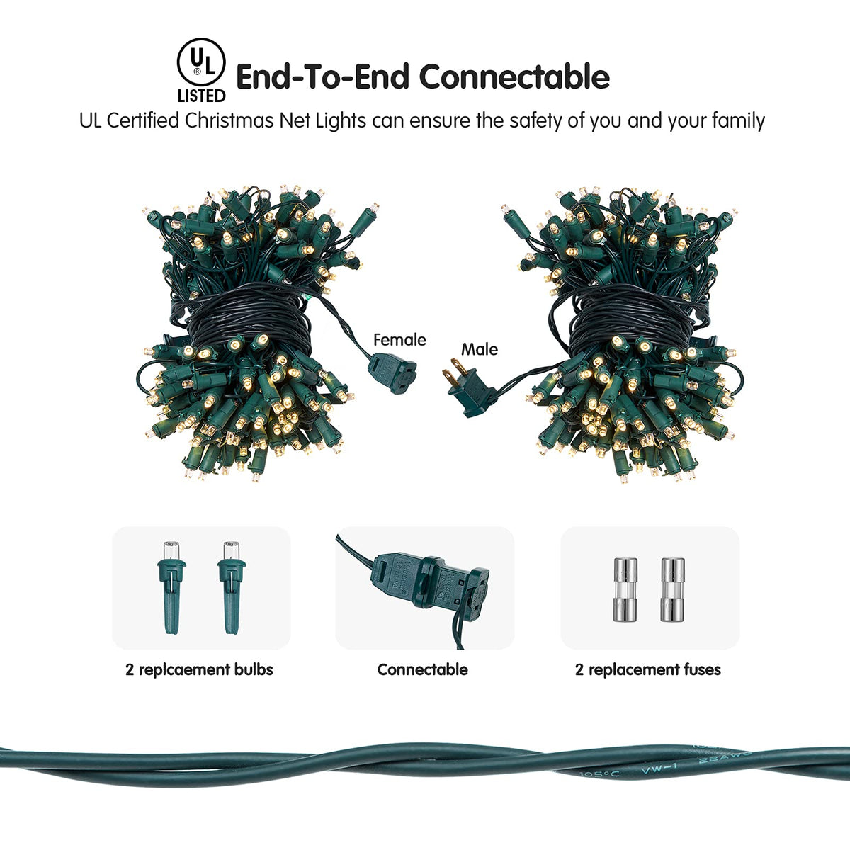 Led Christmas Net Lights Outdoor Christmas Decorations Lights 160Led 5Ftx7Ft, Connectable Waterproof Outdoor Indoor Fairy Mesh Net Lights For Christmas Party, Yard, Patio, Tree, Bushes Decorations (Warmwhite)! Perfect Outdoor Christmas Mesh Net Lights--These Unique And Festive Christmas Outdoor Mesh Net Lights Will Make A Perfect Decorative Effect For Your Yard, Lawn, Garden, Bushes Or Other Special Occasion During The Holidays. Suitable For Indoor And Outdoor Christmas Decorations: These Christmas Net Lights Can Be Used Not Only For Outdoor Decorations, But Also Indoor Decorations. You Just Need To Unroll The Net String Lights Then Mount It At The Place Where You Want To Decorate, Which Will Add The Perfect Festive Atmosphere To Your Home. Durable Ul Certified Christmas Lights: Whole Set String Lights Including String Wire, Led Bulbs And Plug Have Been Certified By Ul. Each Bulb Is Individual, So If One Or Several Bulbs Are Damaged Or Burnt Out, The Other Bulbs Will Work Normally. Specifications: Color: Warmwhite Wire Color: Green Wire Led Quanlity: 160 Led Lead Wire: 9.84Ft Size: 5 Ft*7 Ft Input Voltage : 120V~60Hz Waterproof Rating: Ip44 Lifespan: Over 50,000 Hours Package Included: 1 X 160Led Net Lights 2 X Spare Bulbs(Color Randomly Shipped) 2 X Spare Fuses 1 X Instructions