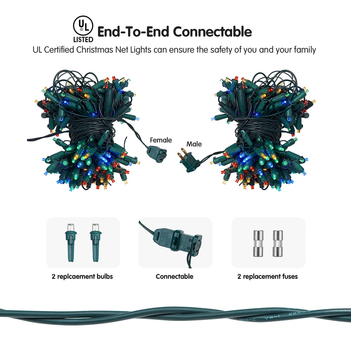 160Led Connectable Mesh Net Lights With Green Wire, Waterproof Fairy String Lights For Christmas Party, Holiday, Wedding, Tree, Bushes Decorations! Perfect Outdoor Christmas Decorations --These Unique And Festive Christmas Outdoor Decorations Will Make A Perfect Decorative Effect For Your Yard, Lawn, Garden, Bushes Or Other Special Occasion During The Holidays. Suitable For Indoor And Outdoor Christmas Decorations: These Christmas Net Lights Can Be Used Not Only For Outdoor Decorations, But Also Indoor Decorations. You Just Need To Unroll The Net String Lights Then Mount It At The Place Where You Want To Decorate, Which Will Add The Perfect Festive Atmosphere To Your Home. Durable Ul Certified Christmas Lights: Whole Set String Lights Including String Wire, Led Bulbs And Plug Have Been Certified By Ul. Each Bulb Is Individual, So If One Or Several Bulbs Are Damaged Or Burnt Out, The Other Bulbs Will Work Normally. Specifications: Color: Multicolor Wire Color: Green Wire Led Quanlity: 160 Led Lead Wire: 9.84Ft Size: 5 Ft*7 Ft Input Voltage : 120V~60Hz Waterproof Rating: Ip44 Lifespan: Over 50,000 Hours Package Included: 1 X 160Led Net Lights 2 X Spare Bulbs(Color Randomly Shipped) 2 X Spare Fuses 1 X Instructions