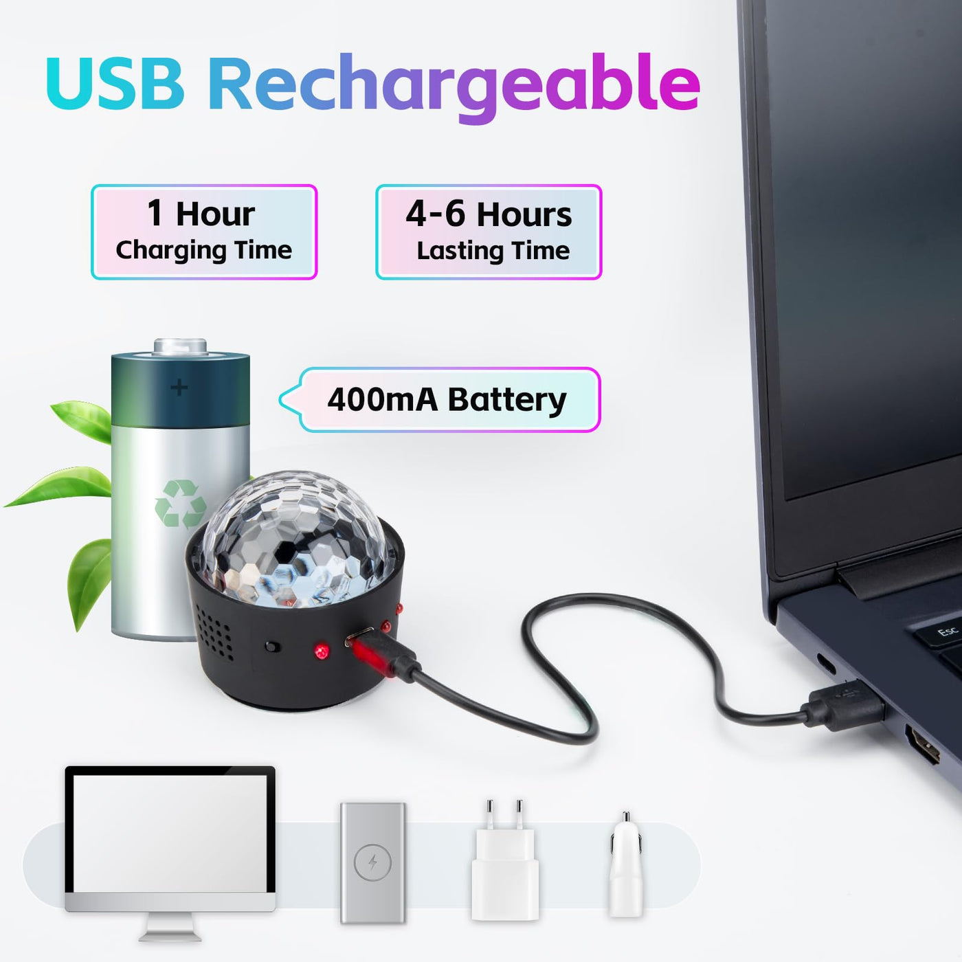 Q: Can the Disco Ball be charged with different devices?A: Absolutely! The Disco Ball comes with a micro charging cable that allows you to charge it using various devices, including a power bank, laptop, car charger, or any standard adapter, making it convenient for on-the-go use.