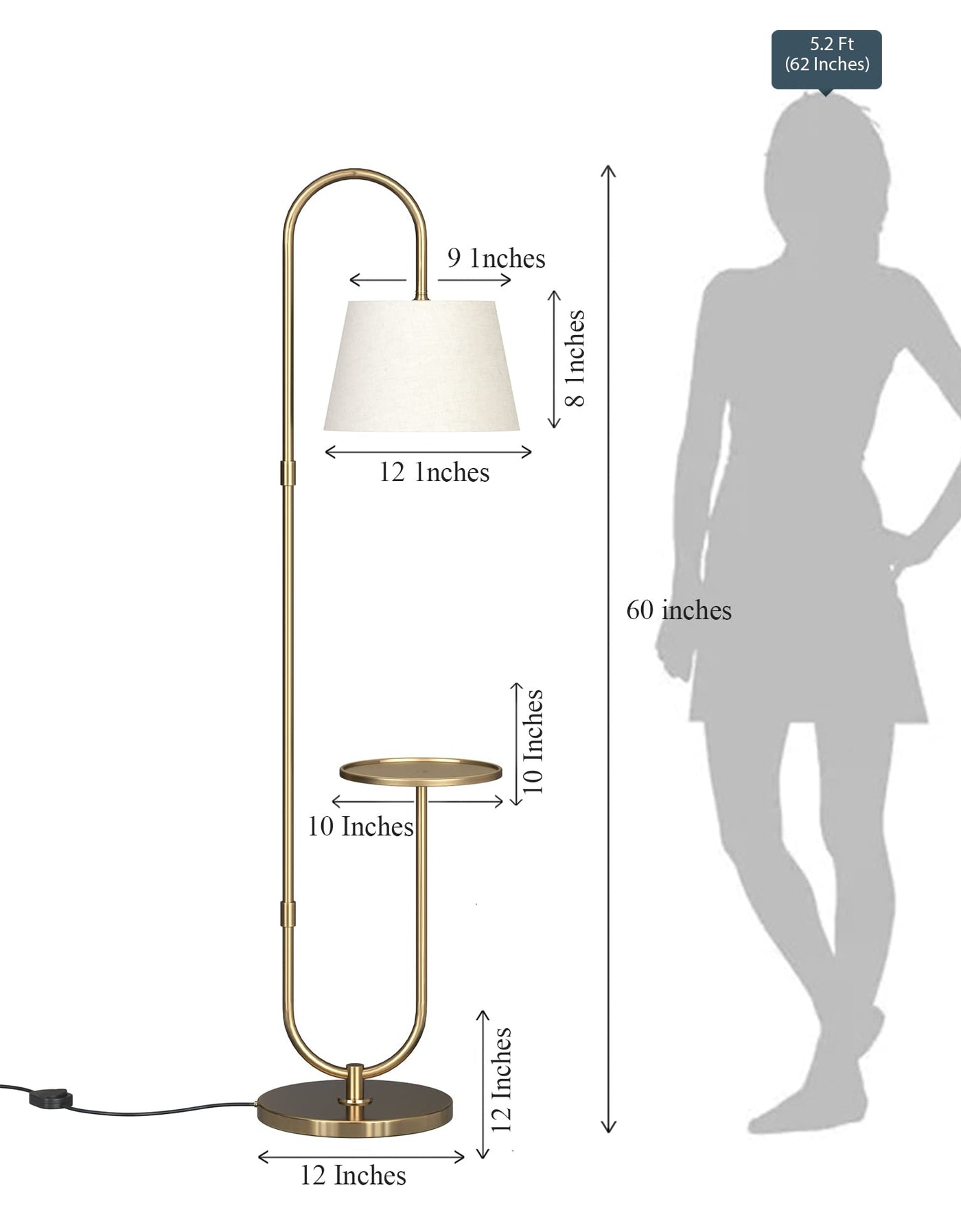 Shop Divine Trends on Amazon Modern Table Shelf Floor Lamp Standing Brass Antique Gold used to keep decor items on the shelf having 10 Inches Diameter will enhance the interiors of your space by giving it an elegant look whether its your home, office or any other place. It is well suited to provide the perfect amount of reading light while setting the ambience and mood of your room.PRODUCT SIZE : (L X B X H) INCHES12 X 12 X 60Finish: Brass AntiqueMaterial: MetalWire: 3.5 Mtr Length With In-Built On-Off Foot Switch & 2 Pin Plug CE certifiedHolder Type: E27Why choose us?- Heavy base which makes the lamp stable and wobble free- Elegant, long lasting finish- Highly durable with Guaranteed long life- On off foot switch for convenience- Strong packagingRecommended Uses- This lamp is an ideal decor piece for your living room, bedroom, dining room, and study room. It is also an excellent buy for offices, restaurants, cafes, hotels.Cotton Lampshade- This floor lamp comes with an Off white lampshade.- Made using quality fabric, it delivers diffused illumination which sets the ambience and the mood of your room.- Shade Size: (Max.Dia X Ht) In Inches: 12X 8Unrivalled Quality- We follow precise quality control measures to ensure that the product(s) you receive are of excellent quality. In the rarest cases that you receive a damaged/ defective product, please reach out to us and let us resolve your issue to the best of our capabilities.Worry-Free Warranty- At KP Lamps Store, we believe in our products. That is why we back all our products with a 12-month warranty and provide friendly customer service with an easy to reach support.Bulb Requirements and Notes- The Bulb is not included in the package.- Compatible with various kinds of bulbs such as incandescent, CFL, LED, and LED smart bulbs.