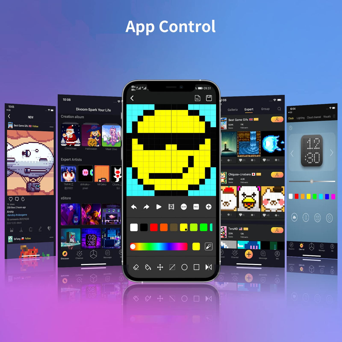 Q: How can I control the Divoom LED Light Display Panel?A: You can control the Divoom LED Light Display Panel through a user-friendly app that allows access to a DIY drawing board, Galleria for animations, and music synchronization features.