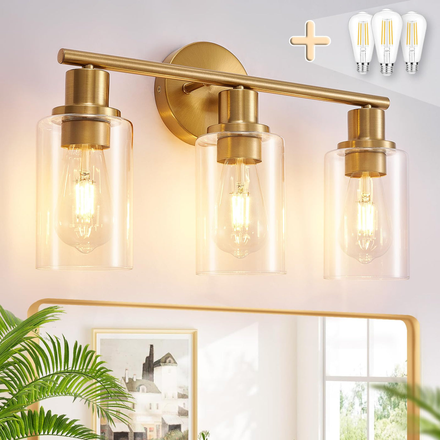 Dllt 3-Light Bathroom Light Fixtures: Gold Modern Vanity Wall Lights With E26 Bulbs - Clear Glass Shade Bathroom Wall Lamp For M