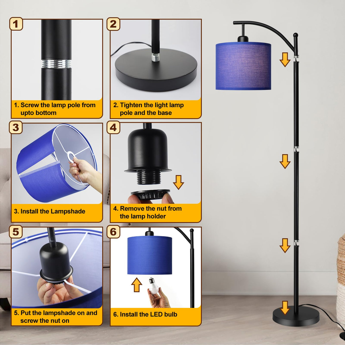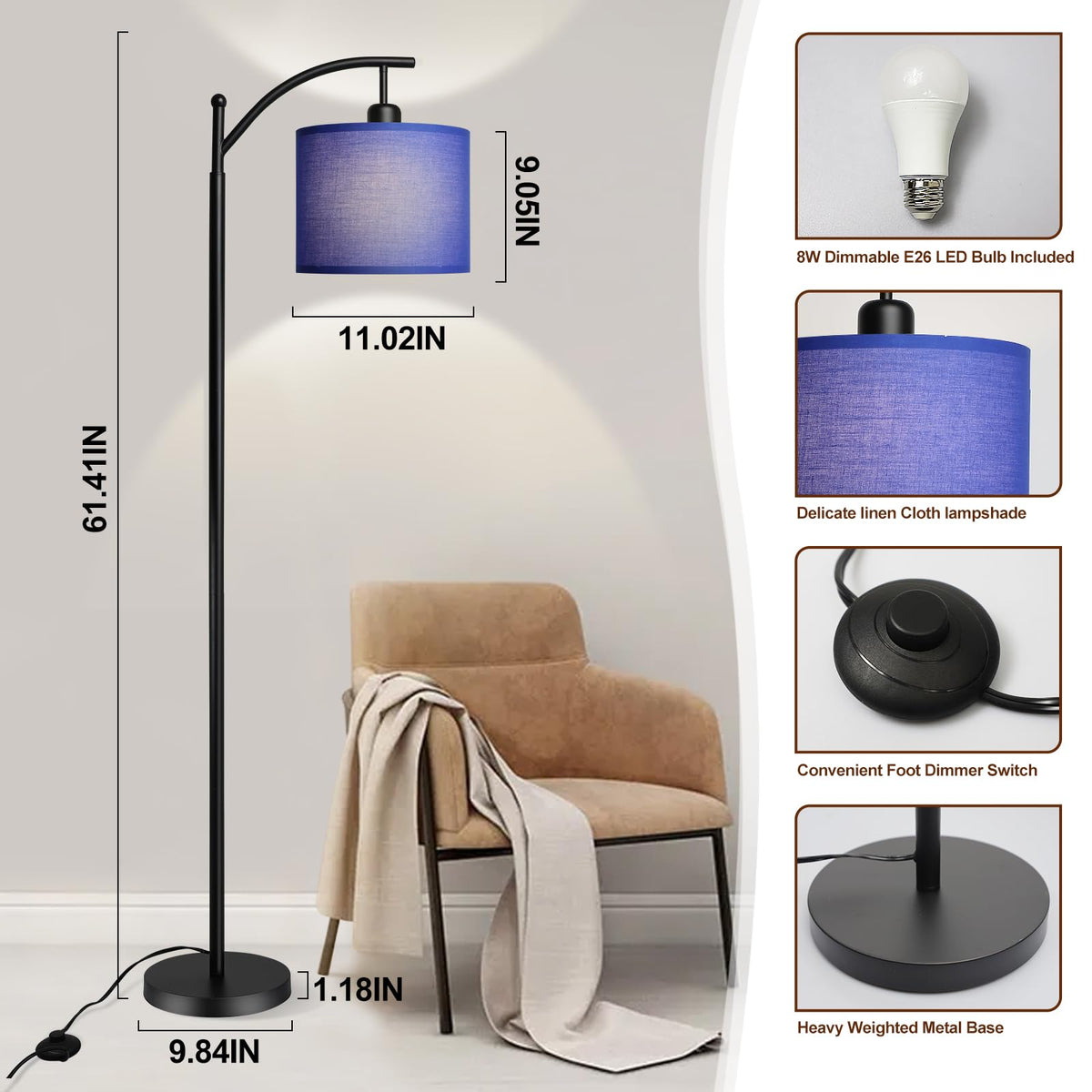 Specifications: Voltage: 110-120V AC Weight: 4.62Kg Material: Metal+linen Color: Black with Blue Lampshade Package Contents: 1*Floor lamp 1*8W light bulb 1*User manual Tips: 1. This pole lamp for reading is not waterproof and should not be used around water, moisture, or any damp setting. 2. The LED bulb will remain hot for several minutes after the arched floor lamp has been turned off. Use caution when attempting to change the 8W bulb. 3. This is not a toy and children should not be allowed to play with the black floor lamp for kids room. 4. If you are not using the stand-up lamp for extended periods of time, unplug the power cord from the outlet.