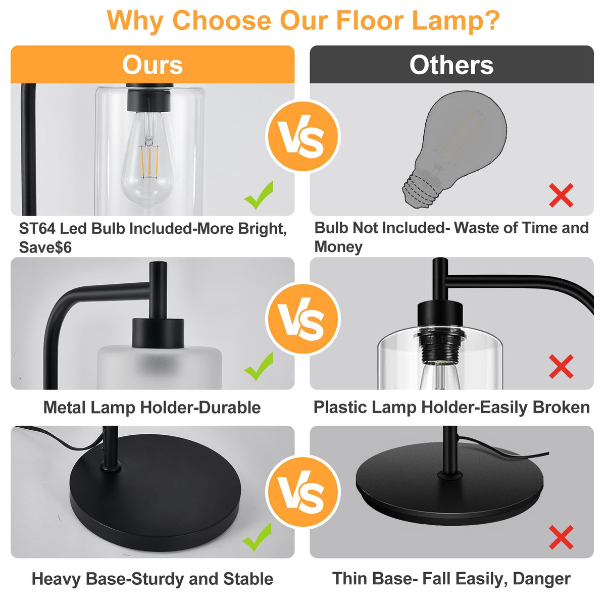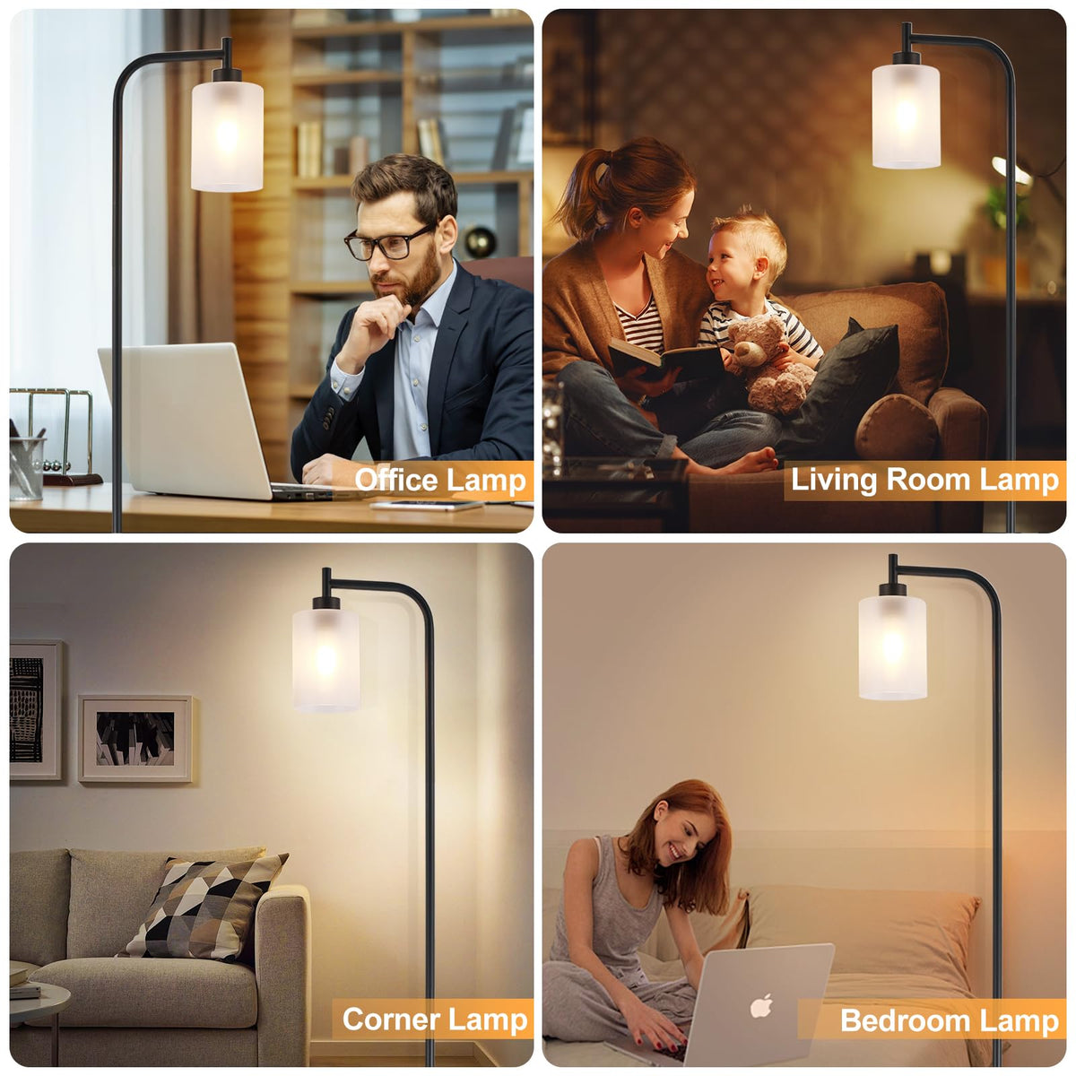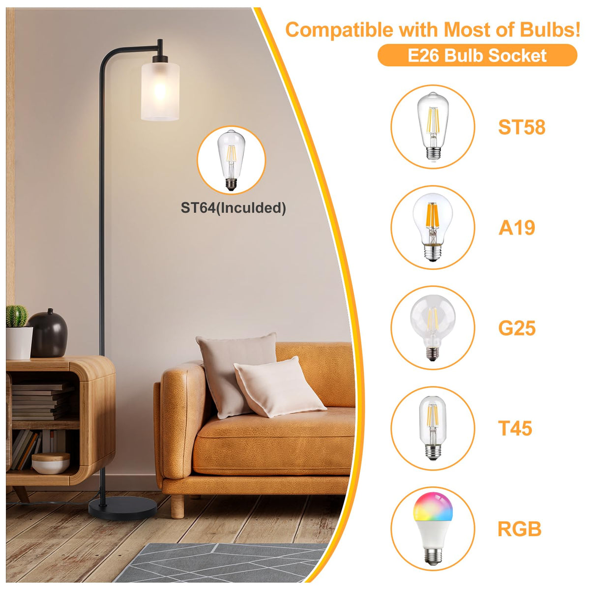 This elegant single-head floor lamp exudes a timeless charm, blending modern aesthetics with practical functionality. At the core of its design is a sturdy metal base, which provides stability and supports the entire structure. The base is crafted from high-quality metal, finished in a sleek and durable matte or polished texture, adding a touch of sophistication to any room. Rising gracefully from the base, the lamp features a sleek and slender metal pole. This pole not only serves as the structural backbone but also adds an element of visual elegance. Its smooth, continuous curve leads up to the lamp's most striking feature: the glass shade. The glass shade is a masterpiece of craftsmanship, designed to distribute light evenly and create a warm, inviting ambiance. Crafted from clear or stained glass, the shade offers a variety of patterns and textures, allowing light to filter through in a beautiful, diffused manner. Whether you prefer a simple, clear design or one adorned with intricate patterns, the glass shade adds a layer of artistic appeal to the lamp. At the top of the pole, nestled within the glass shade, sits an 8W E26 bulb. This energy-efficient bulb provides ample lighting for reading, working, or simply enjoying a cozy evening at home. The E26 standard base makes it easy to replace the bulb when needed, ensuring that you can always maintain the perfect lighting level for your space. For added convenience, this floor lamp is equipped with a foot switch. Located near the base, the foot switch allows you to easily turn the lamp on and off without having to reach for a wall switch or cord. This feature adds a touch of luxury and practicality, making it perfect for use in living rooms, bedrooms, or home offices. Overall, this single-head floor lamp with its glass shade, metal lamp holder, 8W E26 bulb, and foot switch offers a perfect blend of style, functionality, and convenience. It is not just a lighting solution but a beautiful addition to your home decor, enhancing the ambiance and creating a welcoming space for you and your guests. DINGLILIGHTING Modern Farmhouse Floor Lamp ? User-friendly 1. The wires are hidden inside the metal pole then will not affect the appearance. 2. Foot switch feature of tall floor lamp is more convenient to switch the light on/off. ? Optimal Efficiency Compatible With Various Bulbs: E26 base socket is compatible with various bulbs, such as LED, INCANDESCENT, CFL, RGB. (60W MAX) ? Included 8W ST64 Style Light Bulb ?3000K Soft light & Eye-care High light transmittance glass lampshade, the glass floor lamp can emit soft light, anti glare and Flicker free, which protect your eyes and less eye fatigue after working or studying. ? Suitable for Small Corners Whether you read books in a recliner, or work at a desk, the lamp fits easily beside your furniture. Its slender design allows it to position well near the seats, sofas, armchairs, side tables etc. ? Wide Application The classic standing reading lamp especially for bedroom, living room, lounge, study room, office, hotel suite, dinning room. Specifications -Voltage: 120V AC -Power Max.:60W -Bulb Socket: E26 -Material:Metal+Glass -Power Source: corded-electric Package Contents 1*Floor lamp1*8W Warm White Bulb 1*User manual TIPS 1.This standing tall down light is not a toy and don't let children play with the floor lamp. 3.Need to install by yourself, it is recommended to assemble the lamp shade first, then assemble the lamp pole from top to bottom, and finally install the lamp base.