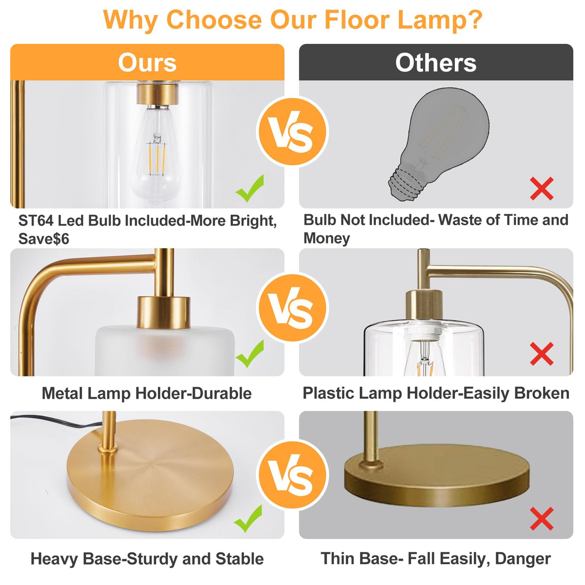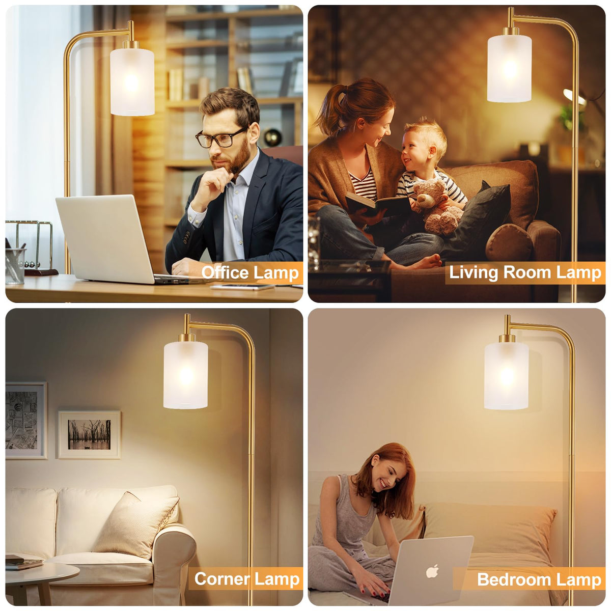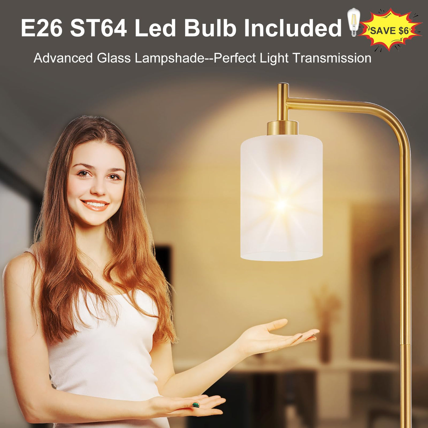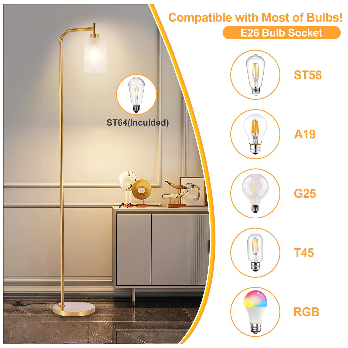 This elegant single-head floor lamp exudes a timeless charm, blending modern aesthetics with practical functionality. At the core of its design is a sturdy metal base, which provides stability and supports the entire structure. The base is crafted from high-quality metal, finished in a sleek and durable matte or polished texture, adding a touch of sophistication to any room. Rising gracefully from the base, the lamp features a sleek and slender metal pole. This pole not only serves as the structural backbone but also adds an element of visual elegance. Its smooth, continuous curve leads up to the lamp's most striking feature: the glass shade. The glass shade is a masterpiece of craftsmanship, designed to distribute light evenly and create a warm, inviting ambiance. Crafted from clear or stained glass, the shade offers a variety of patterns and textures, allowing light to filter through in a beautiful, diffused manner. Whether you prefer a simple, clear design or one adorned with intricate patterns, the glass shade adds a layer of artistic appeal to the lamp. At the top of the pole, nestled within the glass shade, sits an 8W E26 bulb. This energy-efficient bulb provides ample lighting for reading, working, or simply enjoying a cozy evening at home. The E26 standard base makes it easy to replace the bulb when needed, ensuring that you can always maintain the perfect lighting level for your space. For added convenience, this floor lamp is equipped with a foot switch. Located near the base, the foot switch allows you to easily turn the lamp on and off without having to reach for a wall switch or cord. This feature adds a touch of luxury and practicality, making it perfect for use in living rooms, bedrooms, or home offices. Overall, this single-head floor lamp with its glass shade, metal lamp holder, 8W E26 bulb, and foot switch offers a perfect blend of style, functionality, and convenience. It is not just a lighting solution but a beautiful addition to your home decor, enhancing the ambiance and creating a welcoming space for you and your guests. DINGLILIGHTING Modern Farmhouse Floor Lamp ? User-friendly 1. The wires are hidden inside the metal pole then will not affect the appearance. 2. Foot switch feature of tall floor lamp is more convenient to switch the light on/off. ? Optimal Efficiency Compatible With Various Bulbs: E26 base socket is compatible with various bulbs, such as LED, INCANDESCENT, CFL, RGB. (60W MAX) ? Included 8W ST64 Style Light Bulb ?3000K Soft light & Eye-care High light transmittance glass lampshade, the glass floor lamp can emit soft light, anti glare and Flicker free, which protect your eyes and less eye fatigue after working or studying. ? Suitable for Small Corners Whether you read books in a recliner, or work at a desk, the lamp fits easily beside your furniture. Its slender design allows it to position well near the seats, sofas, armchairs, side tables etc. ? Wide Application The classic standing reading lamp especially for bedroom, living room, lounge, study room, office, hotel suite, dinning room. Specifications -Voltage: 120V AC -Power Max.:60W -Bulb Socket: E26 -Material:Metal+Glass -Power Source: corded-electric Package Contents 1*Floor lamp1*8W Warm White Bulb 1*User manual TIPS 1.This standing tall down light is not a toy and don't let children play with the floor lamp. 3.Need to install by yourself, it is recommended to assemble the lamp shade first, then assemble the lamp pole from top to bottom, and finally install the lamp base.