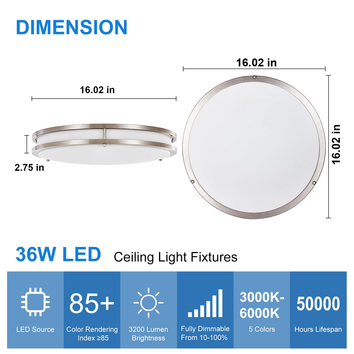 Dllt Flush Mount Led Ceiling Light: 16 Inch 5Cct (3000K-6000K) & Dimmable Ceiling Light Fixtures For Bedroom Hallway - 36W Modern Brushed Nickel Super Bright Kitchen Lighting Fixtures Ceiling