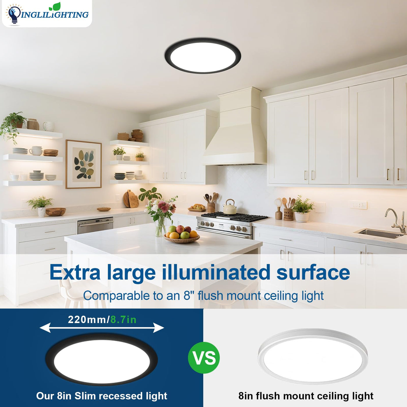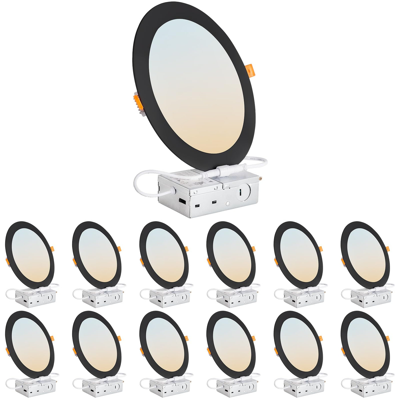 Dllt Led Recessed Ceiling Lights: Black 12 Pack 8 Inch 5Cct Ultra-Thin Lighting With Junction Box For Bedroom - 1800Lm Brightness 18W Eqv 170W Dimmable Canless Wafer Downlight With Etl&Fcc