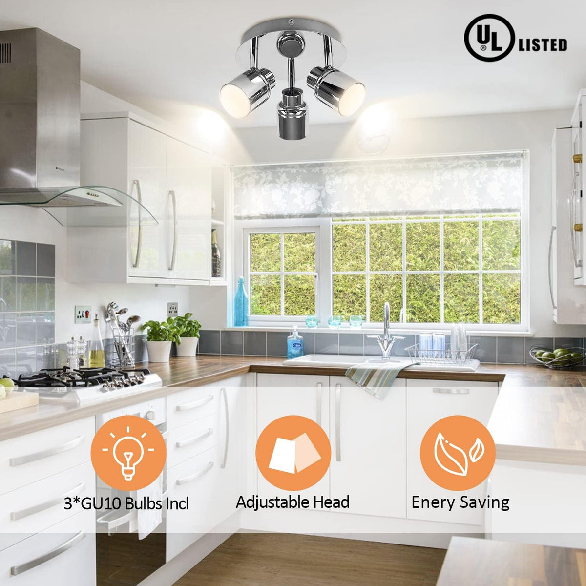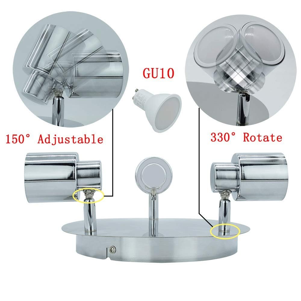 Why choose our adjustable LED ceiling tack light:1. This indoor ceiling spotlights bring additional illumination into a room. New design style which is rotatable in lighting direction provide you different angles irradiation in the night Fantastic retro style single spotlight. 2. Stylish combination of polished chrome with brushed chrome finish, create a romantic and comfortable atmosphere for your sofa, picture, bedside, bed headboard, stairway etc.3. Included 3*3W soft warm light GU10 LED Bulb 50W Halogen, so that you dont need to buy another bulb.Easy to install: Installs like a regular ceiling fixture, also can be installed on a sloped or vaulted ceiling.(Mounting hardware included). Multi-functional Usage:The adjustable track spotlight with superior functionality for applications, Perfectly lighting for such as hallway, aisle, picture, bedside, bed Headboard, mirror, showcase, cabinet, ideally lights up dark corner of the desk bedroom, kitchen, stairway etc.Sepecification:Power:3*3WInput voltage:86-265VColor Temperature:3000KLuminous flux:350lm Material:Aluminum+Acrylic+ChromeBeam Angle:120Track heads rotate 330 & 150tiltWorking Temperature:-20-50?Package:3x GU 10 led bulb1x User manual1x tracking light led adjustable track lighting 3 light ceiling fixture overhead lights for ceilings security spotlight plate ceiling spot light fixture for living room kitchen bedroom ceiling spot light ceiling spotlight track light fixtures led spotlight light