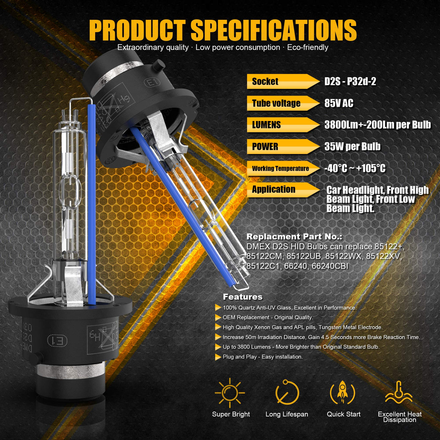 Pack of 2 DMEX 35W D2S Xenon HID Headlight Bulbs - P32d-2Notes: 1.DMEX D2S HID Headlight Bulbs Warranty 24 Months. 2.This is OEM Factory HID Bulbs Replacement, Not Include HID Ballast, Not HID Kit. 3.Before Purchase Please Double Check Your Car Original HID Bulbs Socket. Specifications: Socket : D2S - P32d-2 Tube Voltage : 85V AC Power : 35W per Bulb Lumens : 3800Lm+-200Lm per Bulb Working Temperature: -40°C ~ +105°C Application : Car Headlight, Front High Beam Light, Front Low Beam Light. Replacment Part No.: DMEX D2S HID Bulbs can replace 85122+, 85122CM, 85122UB, 85122WX, 85122XV, 85122C1, 66240, 66240CBI. Features: ? 100% Quartz Anti-UV Glass, Excellent in Performance. ? OEM Replacement - Original Quality. ? High Quality Xenon Gas and APL pills, Tungsten Metal Electrode. ? Increase 50m Irradiation Distance, Gain 4.5 Seconds more Brake Reaction Time. ? Up to 3800 Lumens - More Brighter than Original Halogen Bulb. ? Plug and Play - Easy installation. Available Colors: 4300K - Warm White 5000K - White 6000K - Cold White 8000K - White Blue 10000K - Blue White