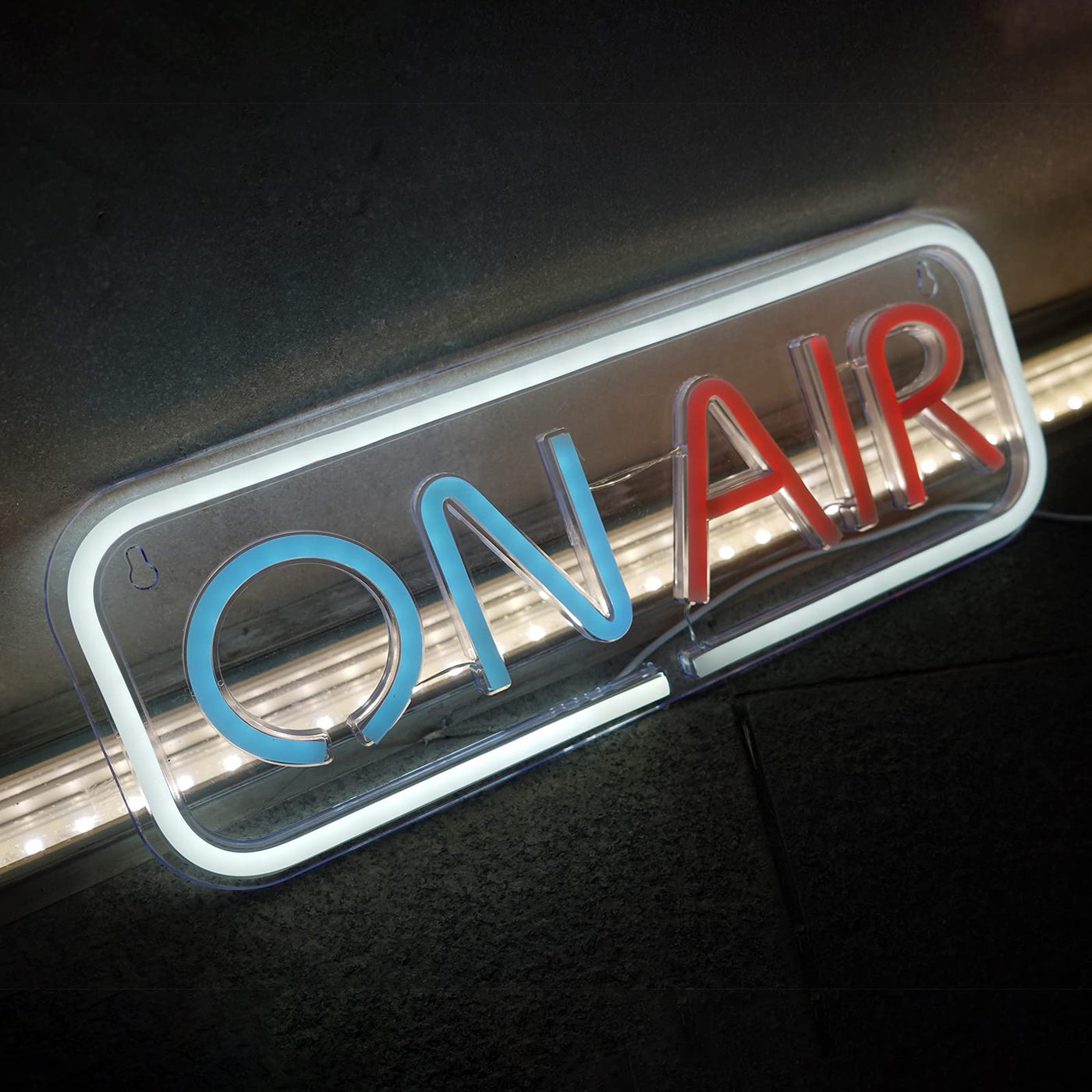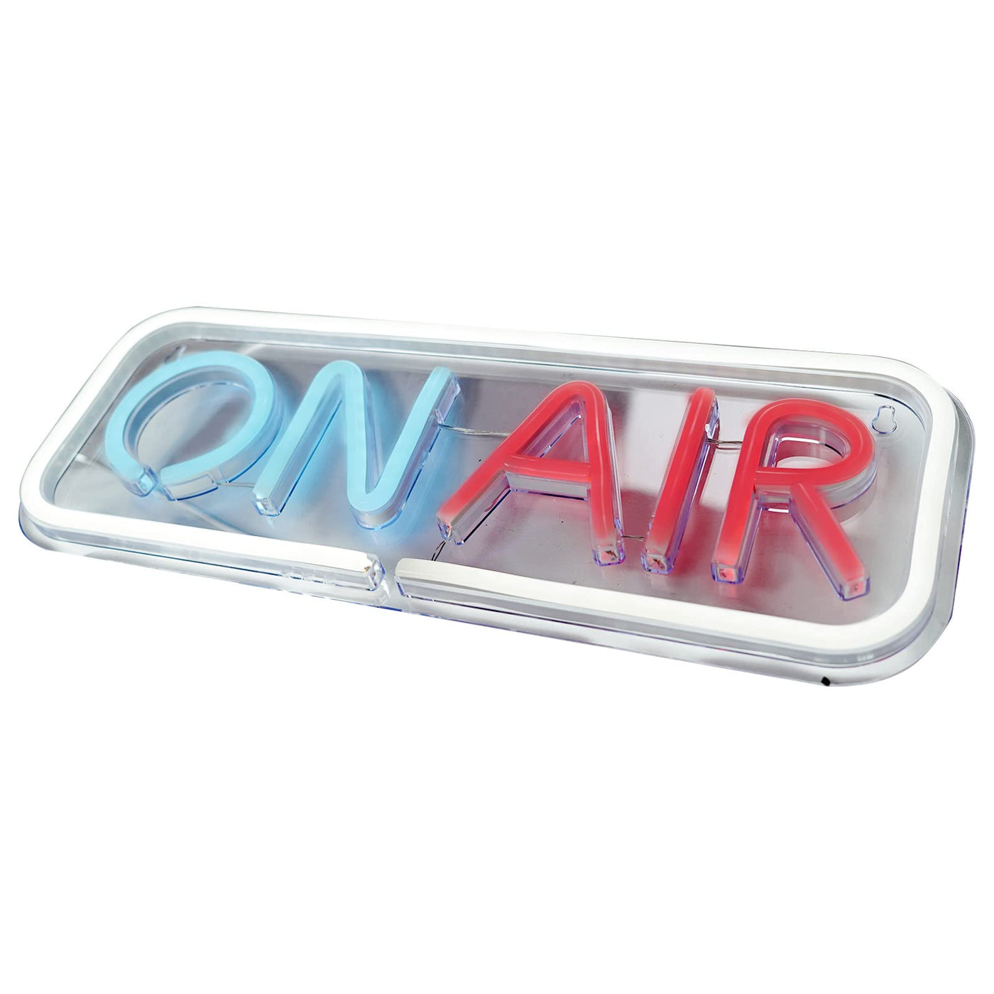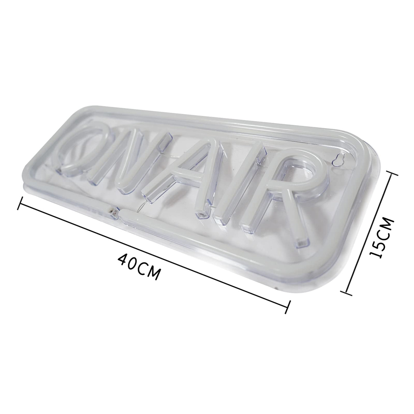 Q: What are the dimensions of the ON AIR Neon Sign?A: The ON AIR Neon Sign measures 5.9 inches in length and 15.7 inches in width, making it a prominent decorative piece that fits well in various setups without taking up too much space.