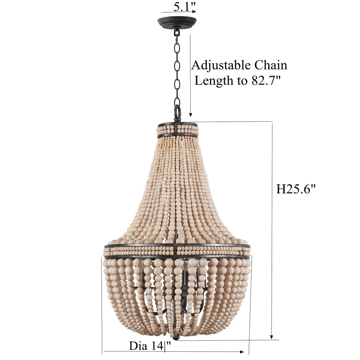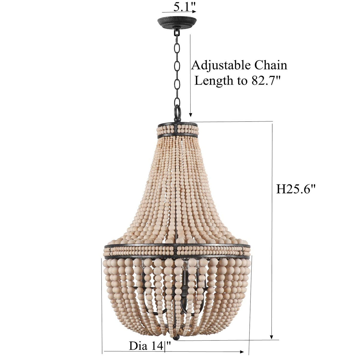 Q: What are the dimensions of the chandelier and is it adjustable?A: The dimension of the DOCHEER wood beaded chandelier is 14.02 inches in diameter and 25.59 inches in height. The adjustable chain allows for a maximum length of 60 inches, enabling you to customize the height according to your space.