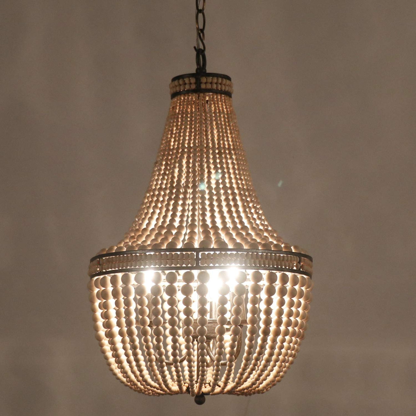 Docheer Oak White Wood Beaded Chandelier, Rustic 3-Light Pendant For Kitchen, Dining & Living Room