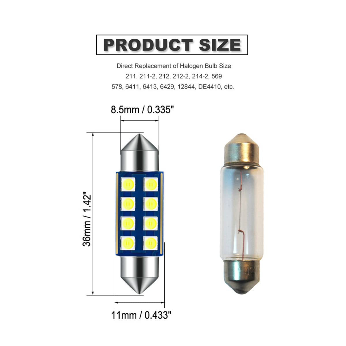 Q: What types of vehicles are compatible with the DODOFUN 12V 36MM LED bulbs?A: The DODOFUN 12V 36MM LED bulbs are designed to fit a wide range of vehicles. They serve as replacements for various bulb sizes including 3425, 6411, 6413, 6418, DE3423, DE3425, and more. It is essential to check your vehicle's specifications to ensure compatibility.
