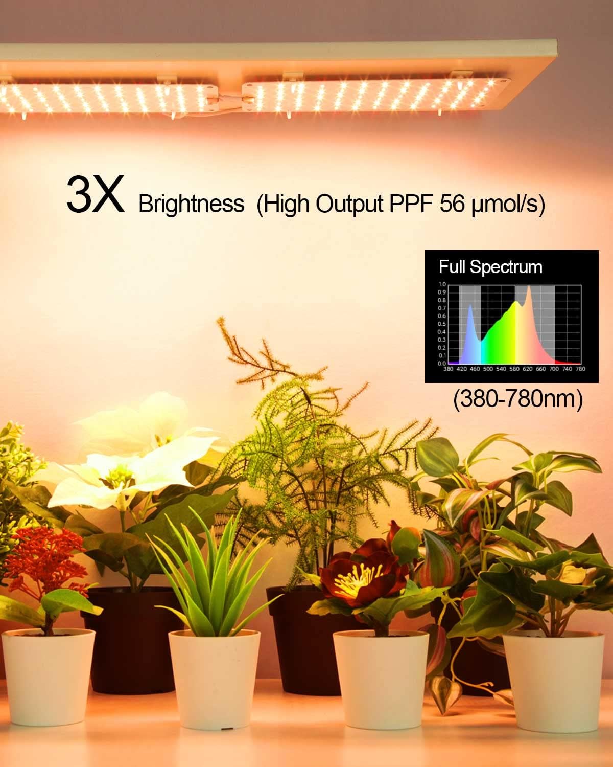 Q: How does the full spectrum feature benefit indoor plants?A: The full spectrum feature of the DOMMIA Grow Lights emits wavelengths from 380nm to 780nm, closely resembling natural sunlight. This allows plants to photosynthesize effectively, promoting healthy growth and thriving indoors throughout the year.
