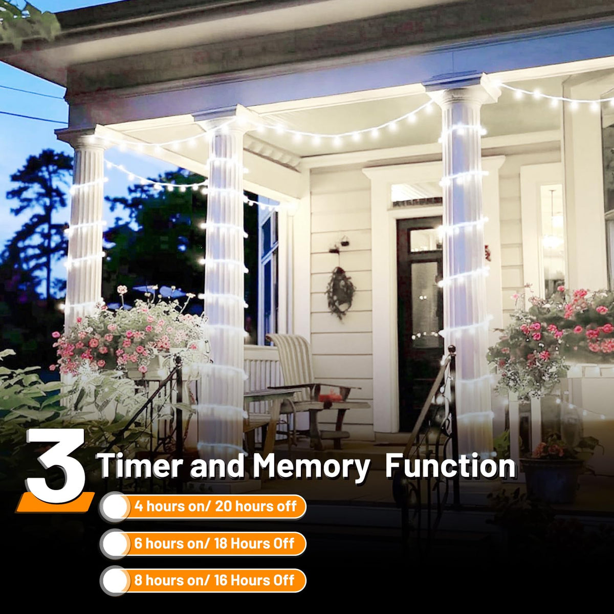 Q: What is the timer function available for the Domolli Christmas Lights?A: The lights include a timer function with three settings: four hours on and twenty hours off, six hours on and eighteen hours off, or eight hours on and sixteen hours off, making them energy-efficient.