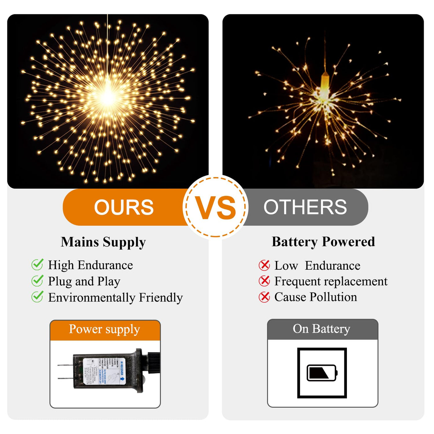 Q: What is the power source for these lights, and how energy-efficient are they?A: The DoonDar Firework String Lights are powered directly from the mains through a plug-in design. This ensures continuous brightness with minimal energy consumption, making them a sustainable lighting solution while providing a safe, cool touch operation.