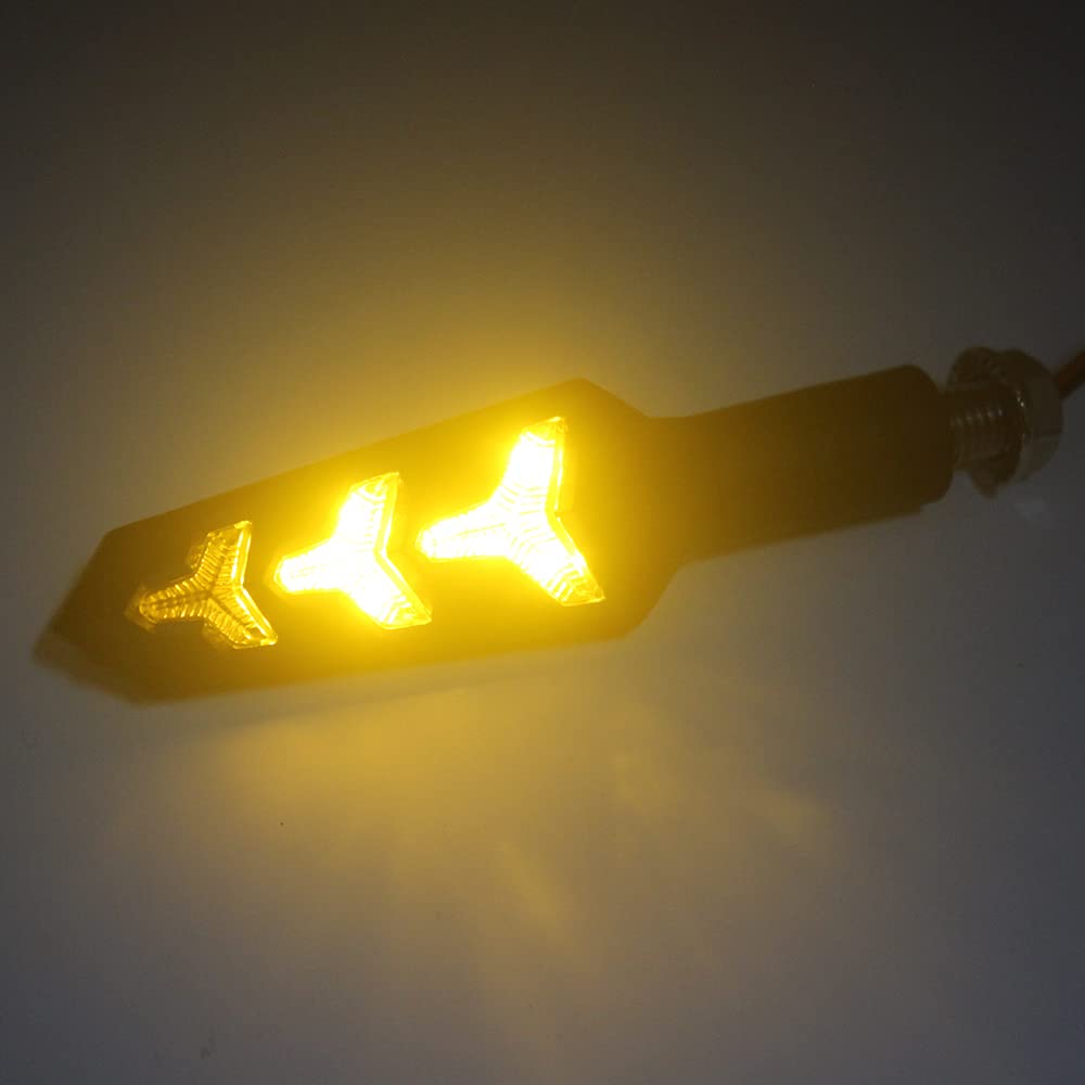 Package of 4PCS Motorbike Scooter Off Road Y Shape Flowing Indicators LEDS Lamps. (Only Flowing Water Model) | ABS plastic material IP67 waterproof,flexible rubber protect lamp from damage ,effectively flowing indicator prevent accident happen. | Input Voltage:DC 12V LED Lamps Model:Flowing Water. | Lamp Size: 4.7Inch x 1.2Inch x 1Inch, Cable Length: 9.8Inch. | Easy Installation,Black Line is Negative, Red Line is Positive, Directly Mount to the Original Turn Signal Light Replacement.
