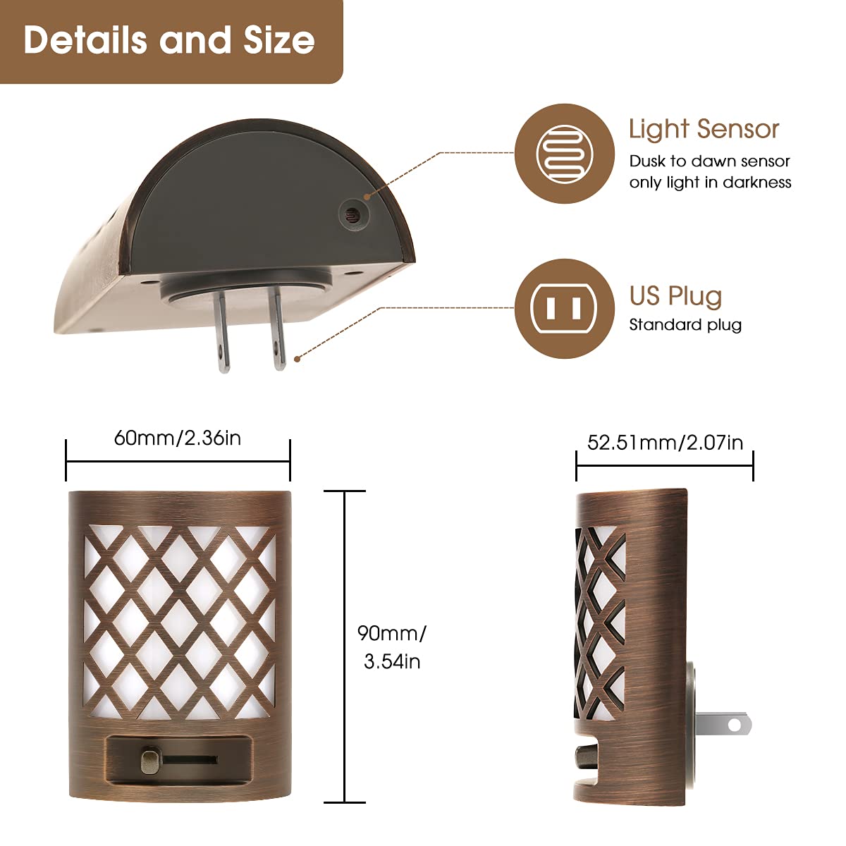 Specification Brand: Doresshop Type: Led Night Light Style:Vintage Base Type: Plug-In Wattage: 1W Color Temperature: 5000K Luminous Intensity: 0-60Lm Special Features: Dimmable+Light Sensor Item Package Quantity: 2 Material: Plastic Input Voltage: 120Vac Dimension: 3.54In(90Mm)*1.42In(36Mm)*2.60In(66Mm)(The Thickness With A Socket Is 2.07In(52.5Mm))