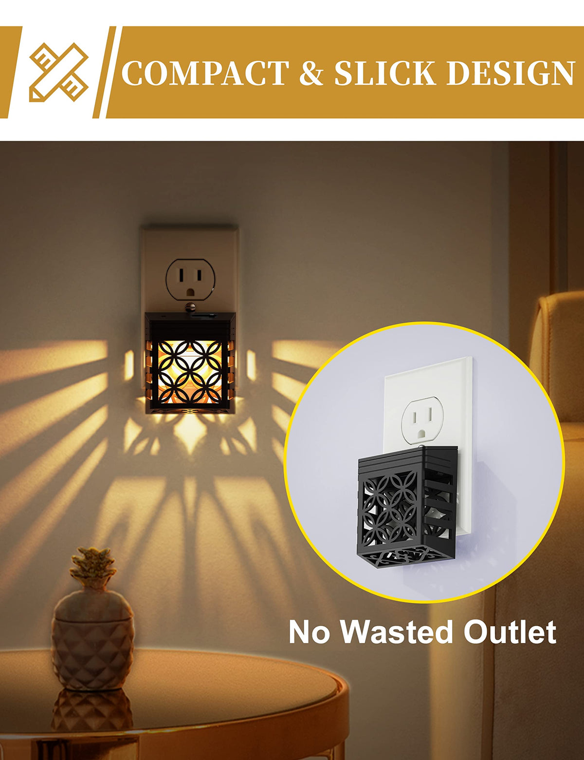 Q: How does the design of the night light complement home decor?A: The night light features a decorative hood that not only offers functional lighting but also adds a designer look to your home. Its compact design ensures it does not block other outlets, making it a stylish addition to any room.