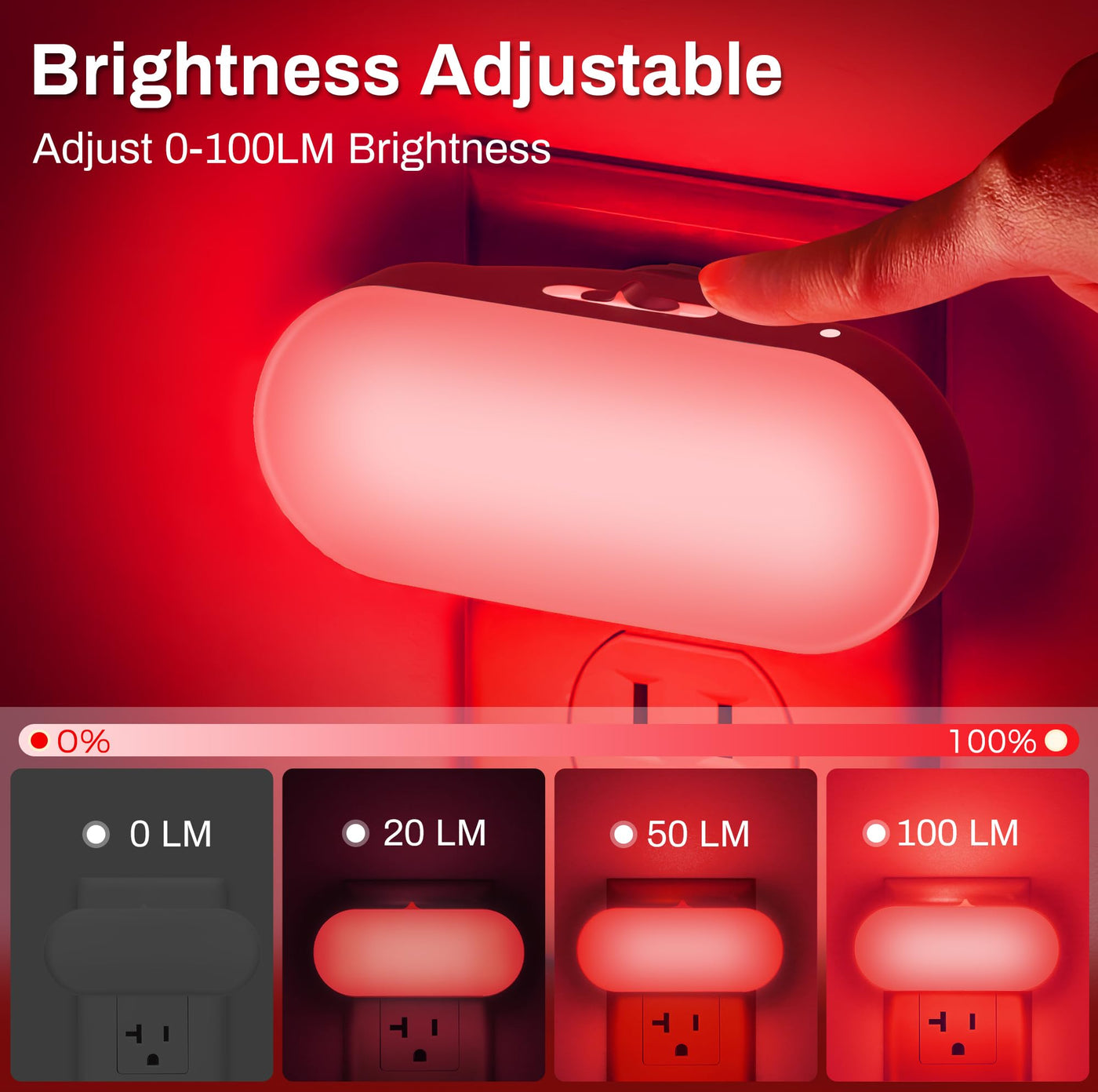 Doresshop Red Night Light, Auto On/Off, 0-100 Lm Adjustable Brightness, Dimmable Plug Into Wall Light Sensor Night Light For Kids Room, Bedroom Night Light, Stair Lights, 1W, 2 Pack