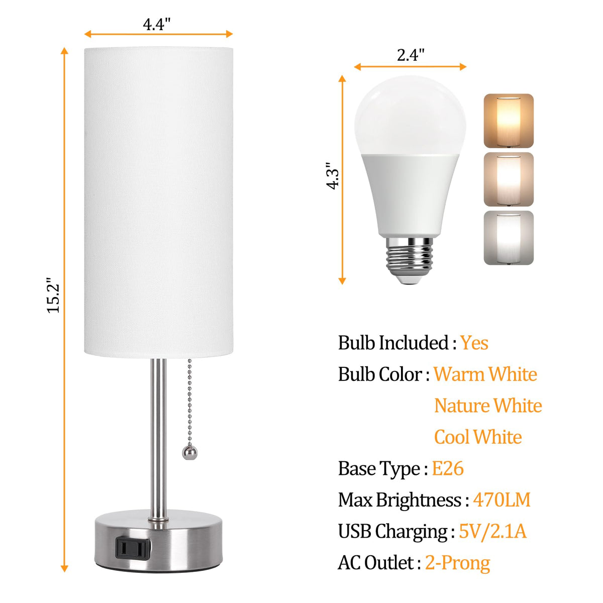 Dott Arts Table Lamp for Bedroom, 3-Color Bedside Lamps with Pull Chain, Bedroom Table Lamps for Nightstand,AC Outlet Small Lamp