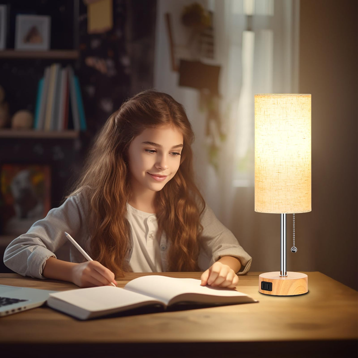 Dott Arts Table Lamp For Bedroom 3-Color Bedside Lamps With Pull Chain Bedroom Table Lamps For Nightstand Ac Outlet Small Lamp For Living Room Bulb Included Oatmeal