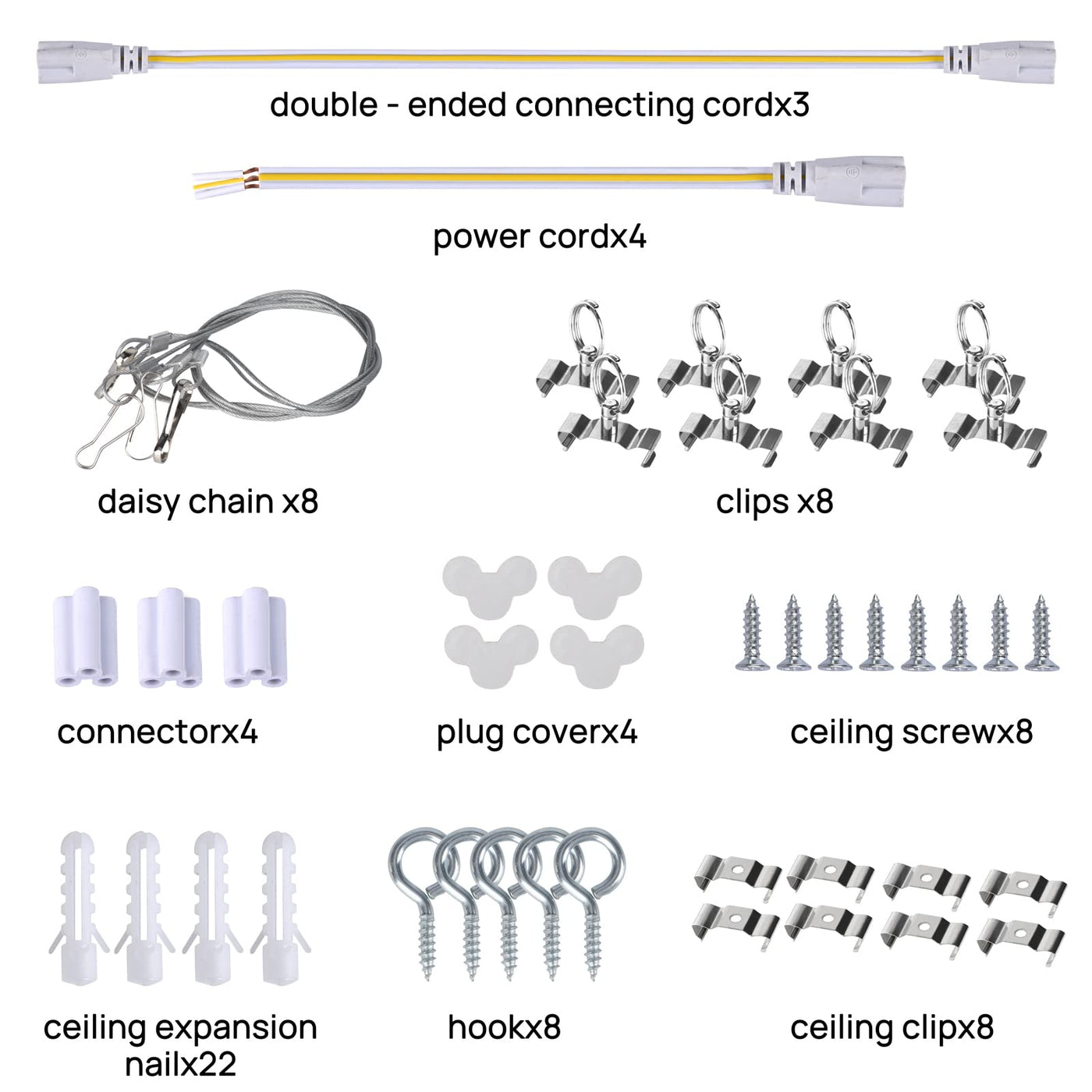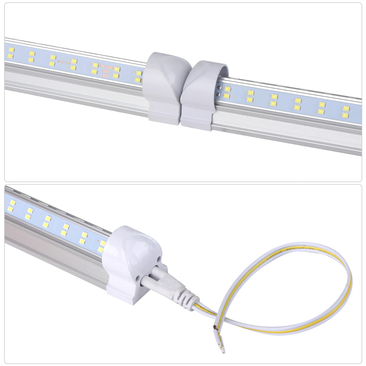 8FT LED Shop Light Set, The LED shop lights set including 12 x T8 8 foot led shop lights, 12 x end caps, 12 x connectors, 48 x screws, 48 x mount clips, 6 x connector cables (47.2inch), 12 x Power cords (11.81inch), and extra 6pcs Power cords with ON/OFF switch (59inch).