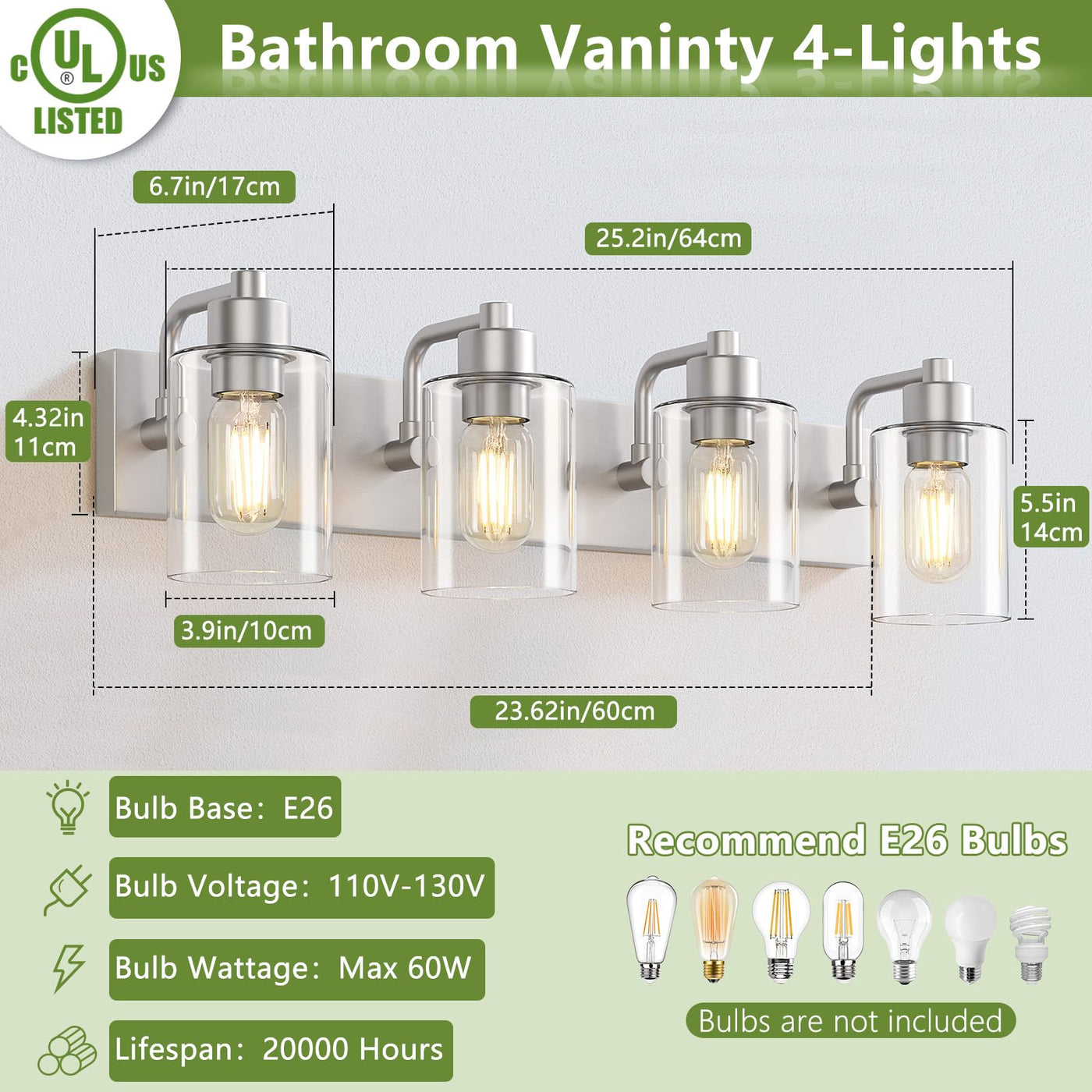 Dpyrrhic Brushed Nickel Bathroom Light Fixtures, Wall Mounted 4-Light Bathroom Lights Over Mirror With Clear Glass Shade,Wall Sc