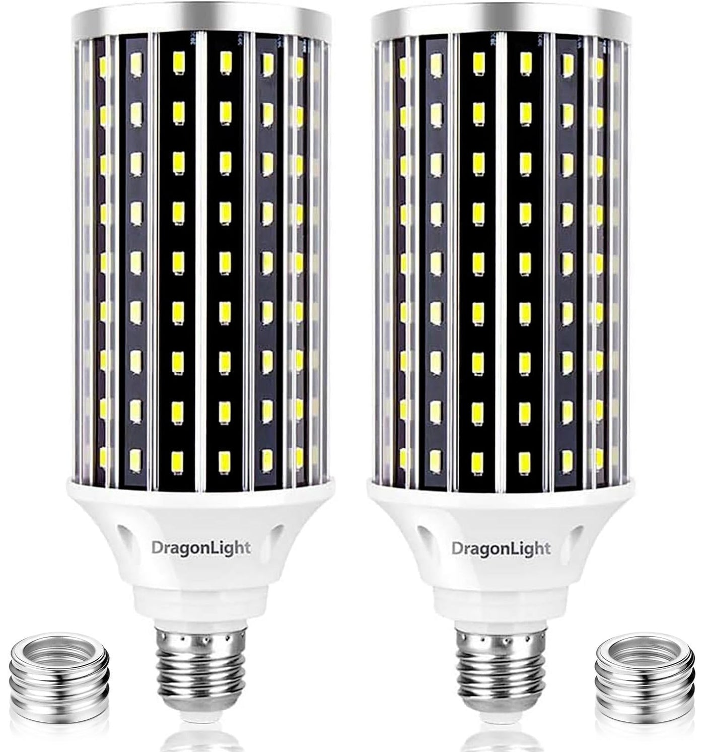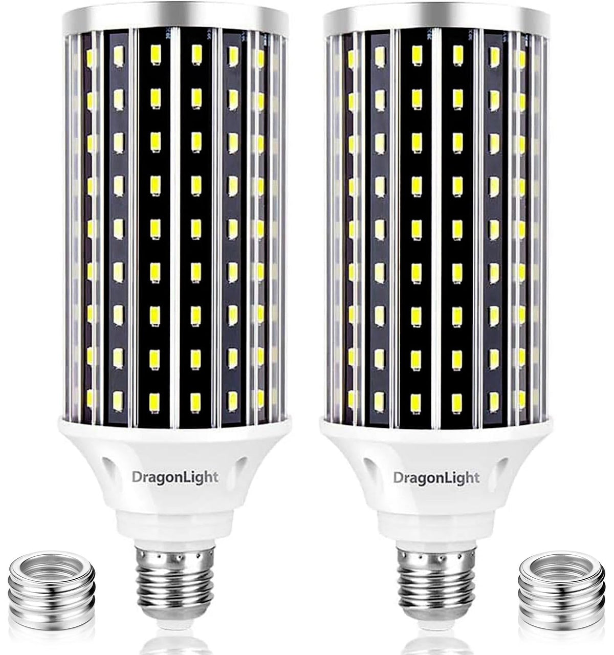 Color:50w / 400w Equivalent / 5500 LM Advantage:Heat dissipation is the key fact for lifespan of high watts LED bulbs,our efficient structure design works out ventilation perfectly,increase the lifespan significantly.Intelligent IC constant current driver, ensure the stable and durable working status.No warm-up,instant on and re-on,no light recession after multiple switches.Green and eco-friendly,no harmful elements such as mercury,UV,xenon,IR.Light is soft and uniform,safe to eyes.Technical Specification: Wattage: 50W Brightness:5,500 Lumen Lumen Efficacy: 110LM/W Color Temperature: 6000K(Daylight Cool White) Color Rendering Index (CRI): 80+ Beam Angle: 360 Start Up Time: 0.3second Lifespan: 50000 hours Working Voltage: AC100-277V Working Temerature:-4~+113?Socket: E26/E39 Item Size:H:7.87''x F2.91'' Item Weight:0.6lbApplication: Strong adaptability,suitable for any orientation with same lighting illumination. High power LED Bulb,great for flood light,high bay light, home&garage lighting,security light, warehouse light, street light,office lighting,offer stable and durable lighting solution for commercial&Industrial projectAttentions: Switch off the power before replacing the bulb This bulb is non waterproof,ideal for indoor and protected outdoor fixtures Please DO NOT use this bulb in totally enclosed lamp,high watt LED bulb needs heat dissipation,otherwise it may cause damageThis bulb is non-dimmableWhat You Get: 2 x 50 Watt LED Corn Cob Light Bulbs 2 x E39 to E26 Adapter 2 Years hassle-free quality guarantee and free replacement serviceWarm Tips: How to judge your lamps socket type:E14: Diameter 14mm(0.55inch)E26: Diameter 26mm(1.02inch)E39: Diameter 39mm(1.54inch)DragonLight 50W LED corn light bulb's base is E26/E39
