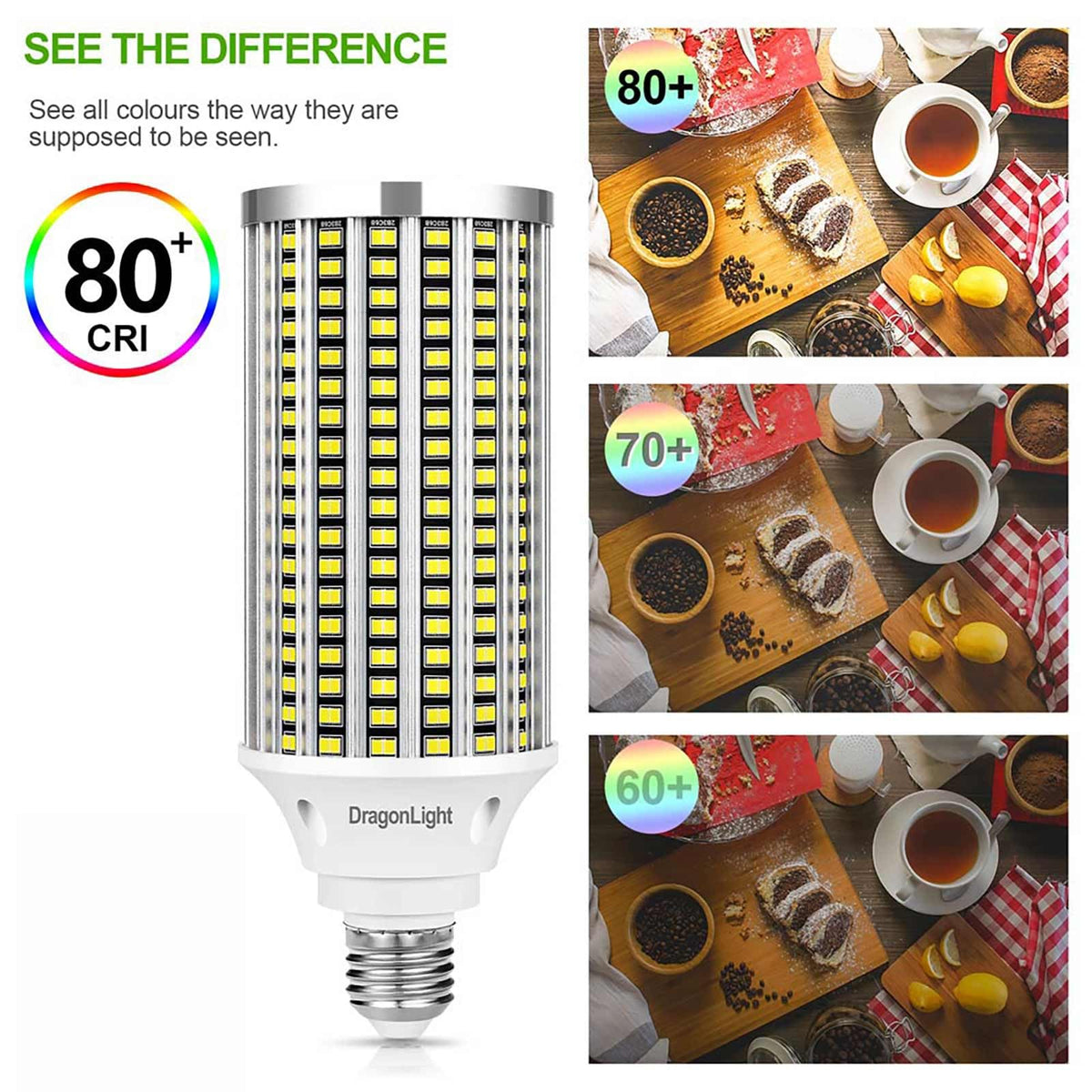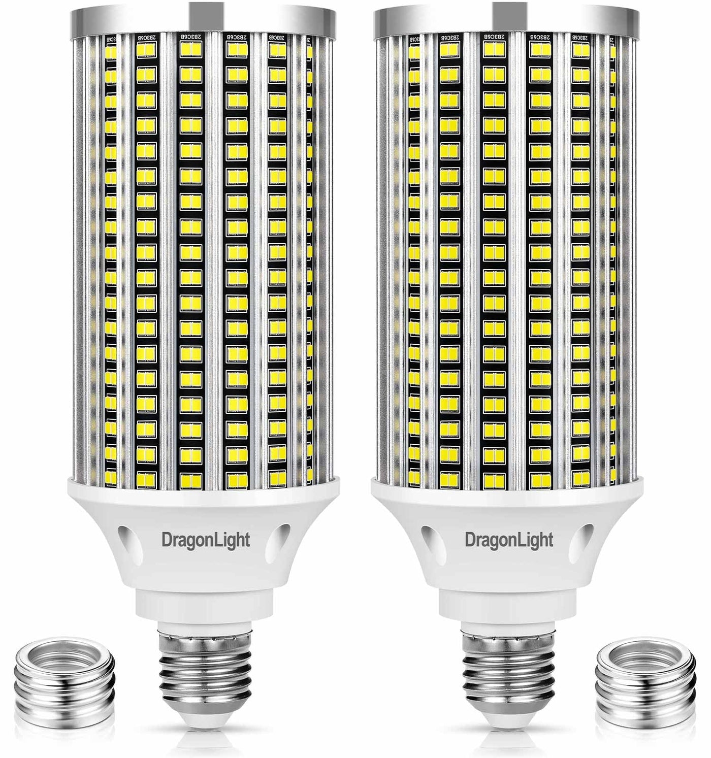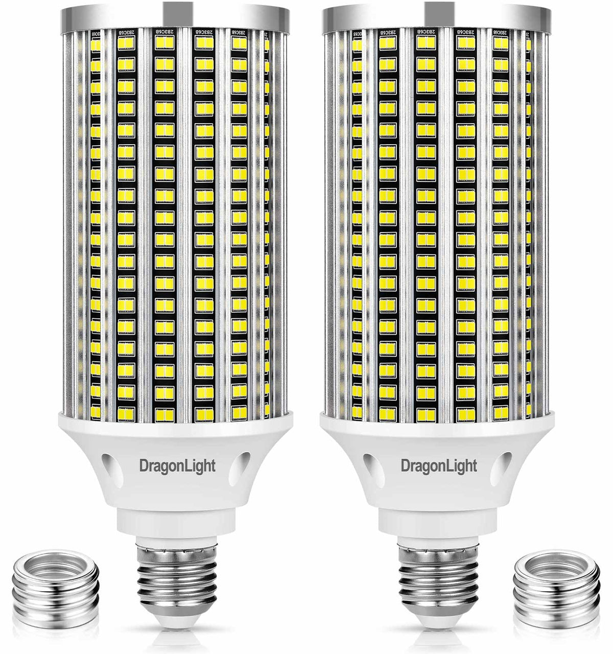 Color:60w / 500w Equivalent / 7200 LM Advantage:Heat dissipation is the key fact for lifespan of high watts LED bulbs, our efficient structure design works out ventilation perfectly, increase the lifespan significantly.Intelligent IC constant current driver, ensure the stable and durable working status.No warm-up, instant on and re-on, no light recession after multiple switches.Green and eco-friendly, no harmful elements such as mercury, UV, xenon, IR. Light is soft and uniform, safe to eyes.Technical Specification: Wattage: 60W Brightness:7200 Lumen Lumen Efficacy: 120LM/W Color Temperature: 6000K(Daylight Cool White) Color Rendering Index (CRI): 80+ Beam Angle: 360 Start Up Time: 0.3second Lifespan: 50000 hours Working Voltage: AC100-277V Working Temerature:-4~+113?Socket: E26 Item Size:H:7.87''x F2.9'' Item Weight:0.62lbApplication: Strong adaptability, suitable for any orientation with same lighting illumination. High power LED Bulb, great for flood light, high bay light, home&garage lighting, security light, warehouse light, street light, office lighting, offer stable and durable lighting solution for commercial&Industrial projectAttentions: Switch off the power before replacing the bulb This bulb is non waterproof,ideal for indoor and protected outdoor fixturesThis bulb is non-dimmableWhat You Get: 2 x 60 Watt LED Corn Cob Light Bulbs 2 Years hassle-free quality guarantee and free replacement serviceWarm Tips: How to judge your lamps socket type:E14: Diameter 14mm(0.55inch)E26: Diameter 26mm(1.02inch)E39: Diameter 39mm(1.54inch)DragonLight 60W LED corn light bulb's base is E26