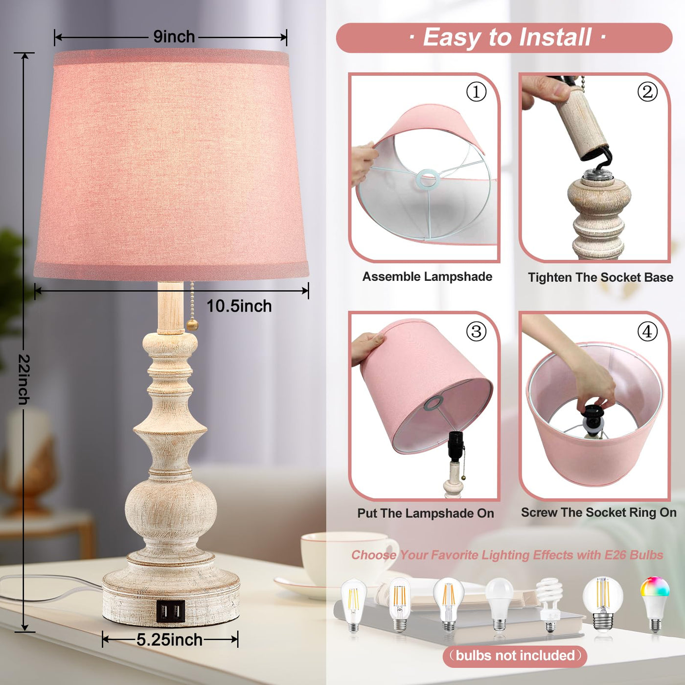 Drawealth 22'' Bedside Table Lamps Set Of 2 Modern Farmhouse Nightstand Lamps For Bedroom With Usb Charging Ports Vintage Boho T