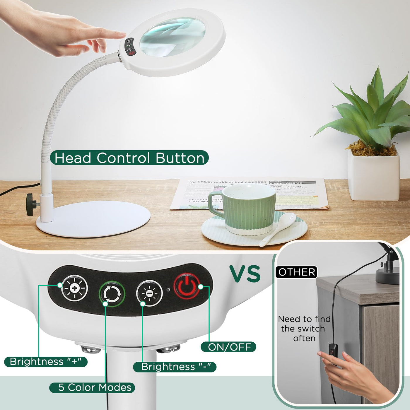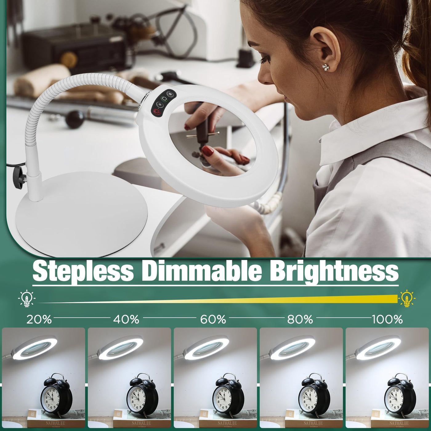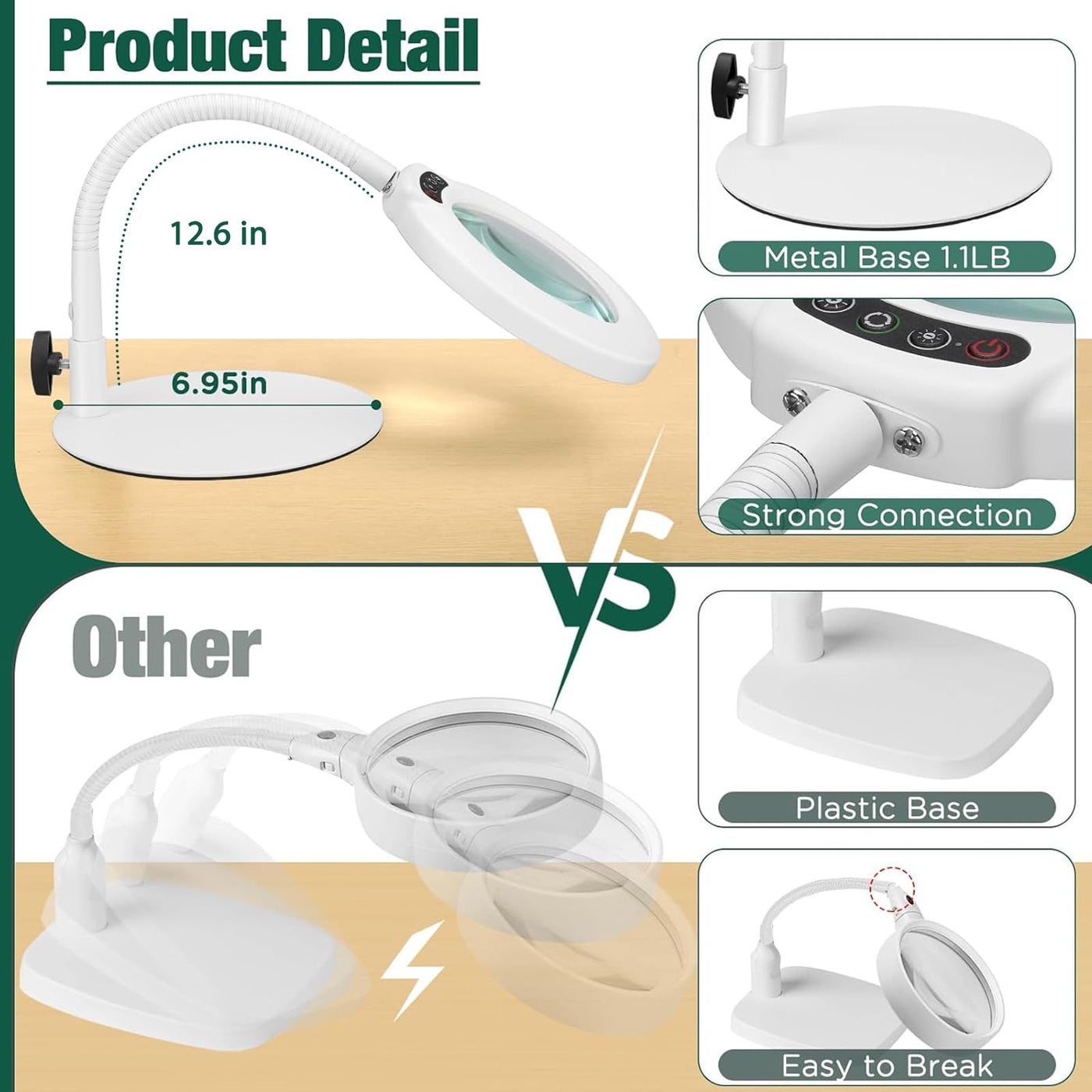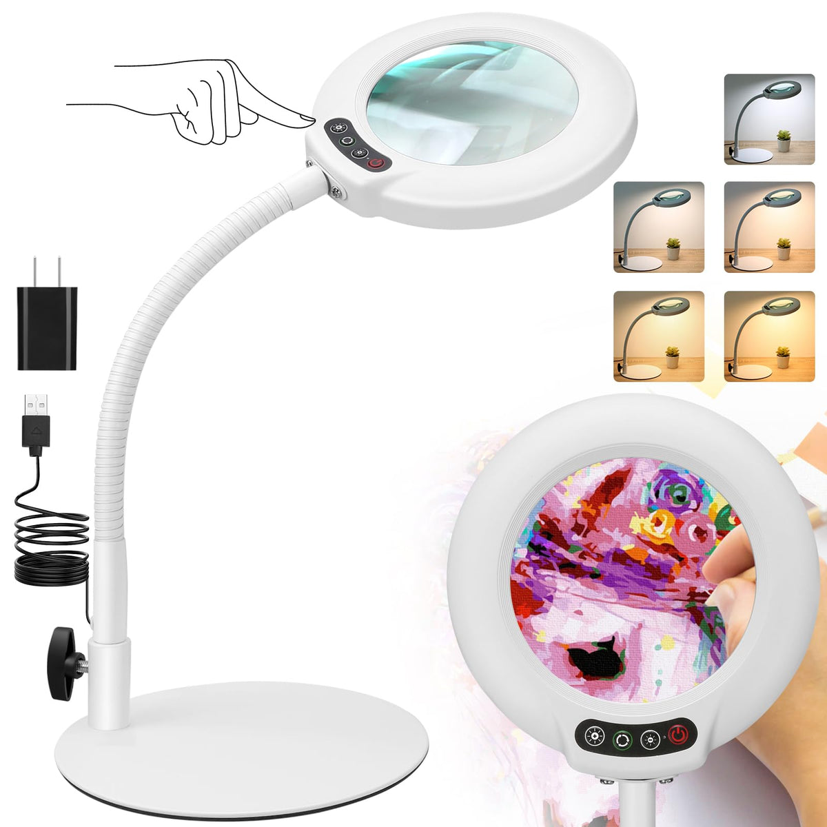 10X gooseneck magnifying desk lamp is very easy to assemble, can be placed on any desktop, free your hands, let you focus on fine work, suitable for office, study room, even bedroom. 10x Clear Magnification- Up to 10x magnification 4.3-inch lens made of aberration-free real glass provides a clearer view for a clearer view. 5 Color & Adjustable Illumination- Create endless lighting possibilities with the magnifying desk lamp's 5 color mode combinations and stepless dimming design. Long press the brightness button to easily adjust between 10%~100% brightness. Sturdy Base: The base is made of high-quality metal, weighs 1.1 pounds and has a diameter of 6.95 inches, which will be more secure and stable when used on various flat surfaces without tipping. Head Buttons for Greater Convenience- The switch of the desk magnifier is at the head of the light, you can easily control the switch by reaching out. Conventional adapters for more convenience and less hassle! Specifications:Exterior Color: White Glass Magnifier: 4.3 inches Magnification: 10X/1000% Color Temperature: 5 Color Modes Illumination: 10%-100% Adjustment Rated Voltage: 110V-220V Gooseneck Length: 12.6 inches Base diameter: 6.95 inches Package Includes:1 * Magnifying Desk Lamp 1 * Metal Base 1 * AC 5V/2A adapter1 * User's manual