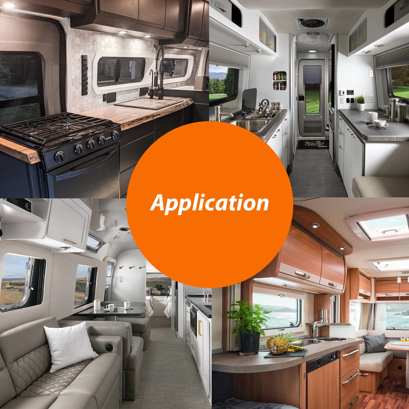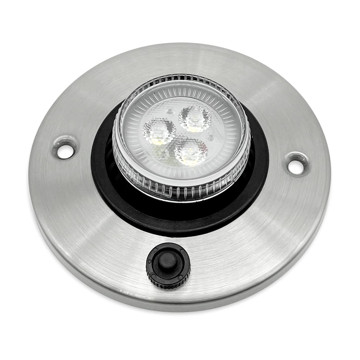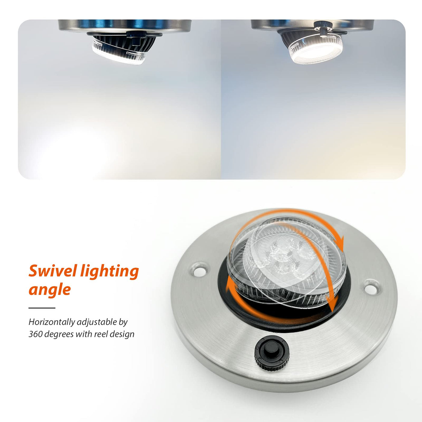 Energy-saving LED ceiling/cabinet light fixture is here. The working voltage is 12volt DC. It's perfect for caravan, camper trailer, motor home, 5th wheel, boat and other vehicles. -Unlike the old generation of down lights, its lighting position is adjustable by the gimbal. -The switch on the bezel provides great convenience. It also can be wired to an additional switch when the light is not easy to reach. -Lighting performance is stable. LED mounted on an aluminum PCB which ensures efficient heat sink. -Adopting energy-saving LED chips, this light consumes 2 watt low power to emit bright 110 lumens. That is an ideal light fixture to save vehicle power for your trip. LEDs have long life span up to 50,000 hours. -The light body is made of coated metal which makes it solid and durable. -What's more, thanks to a fire resistant pc frosted lens, this light not only has good lighting distribution without glare but also is a safe lighting fixture. -Neat and clean finish you can get from recessed mount design. Specifications: Working Voltage: 10-15volt DC Power consumption: 0.15A, 2W Luminous Flux: 130lm Color Temperature: 4000k CRI (color rendering index): >80 Lens made of fire resistant frosted PC Recessed mount design Efficient heat sink No mounting hardware includedDimensions: 3.85 X 3.85 X 1.45 inch / 98 X 98 X 37 mm It also works with an additional switch!